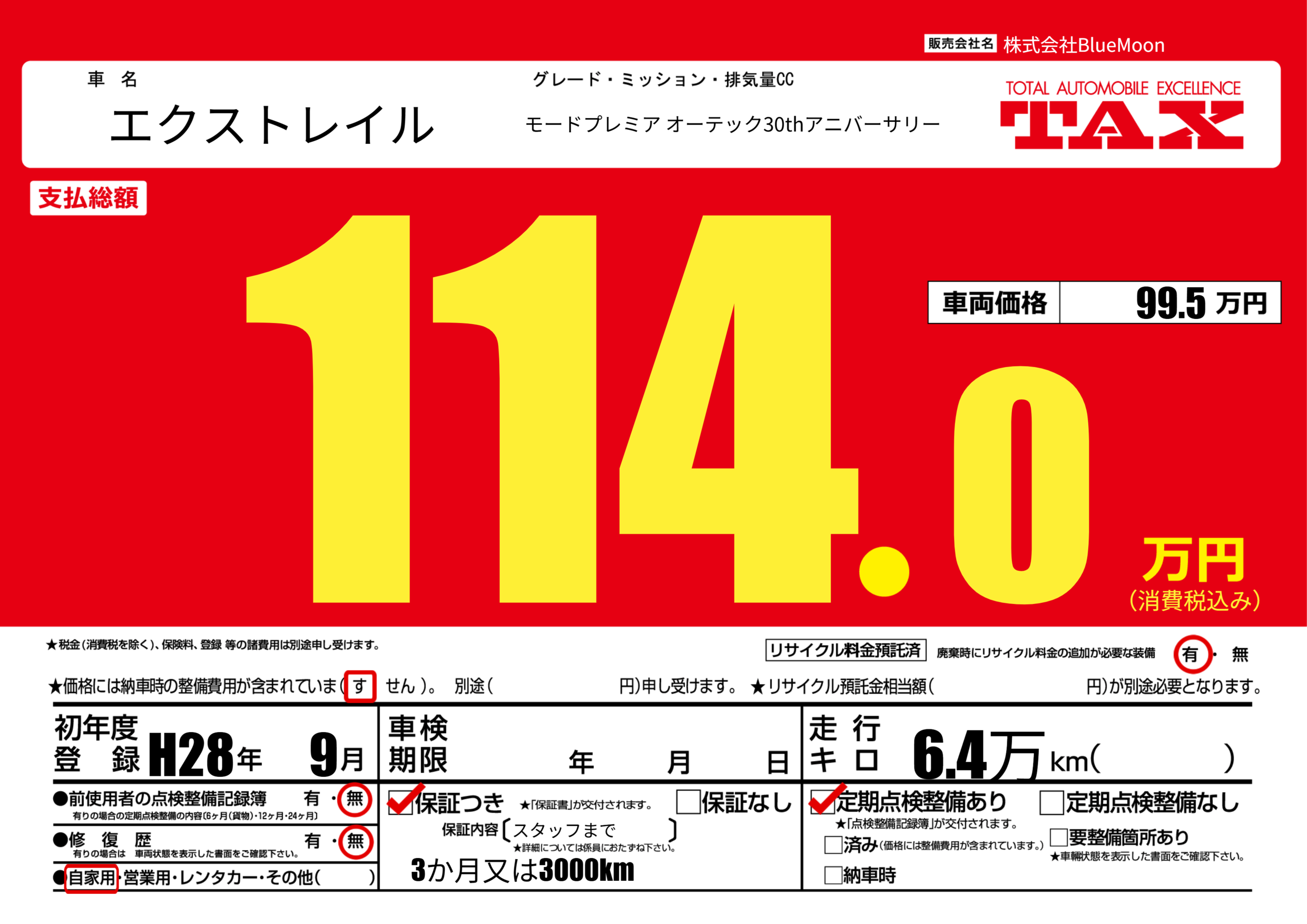 | 走行キロ | 0.6万km | 初年度登録 | H28年9月 |