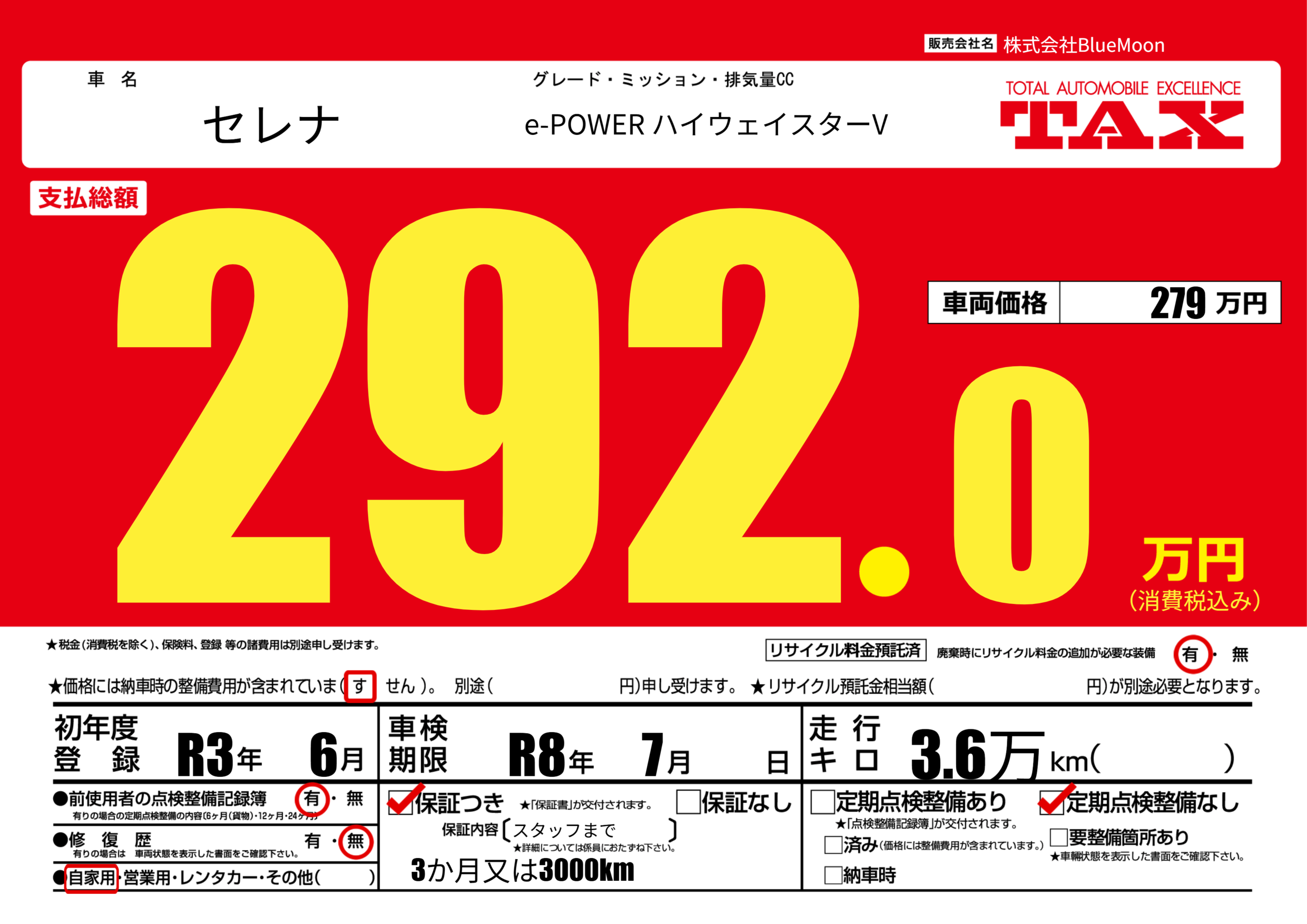 保証付き 保証内容(スタッフまで) ---ヶ月または()千kmまで |