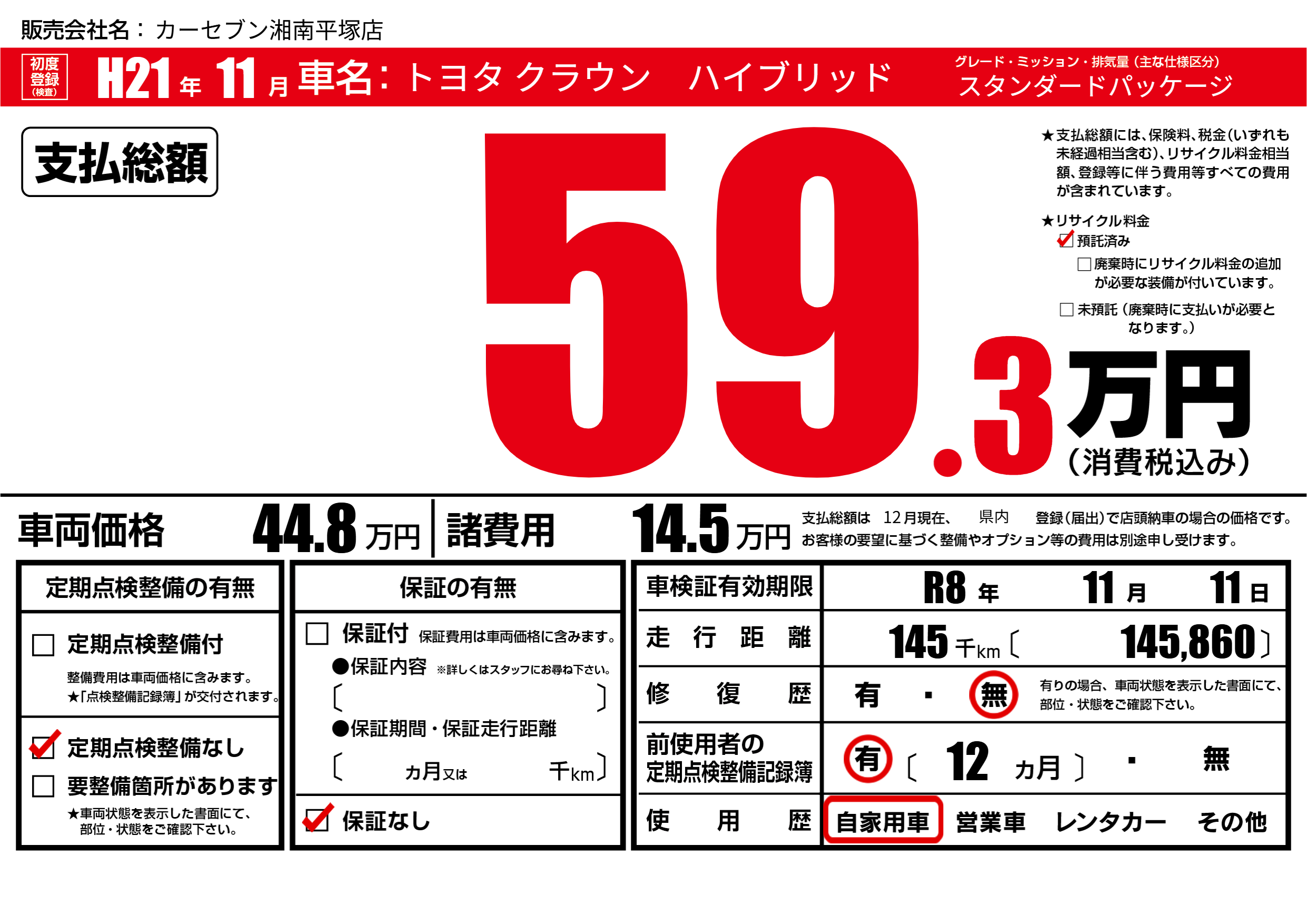 | 車名 | トヨタ クラウン ハイブリッド | グレード ミッション 排気量 |