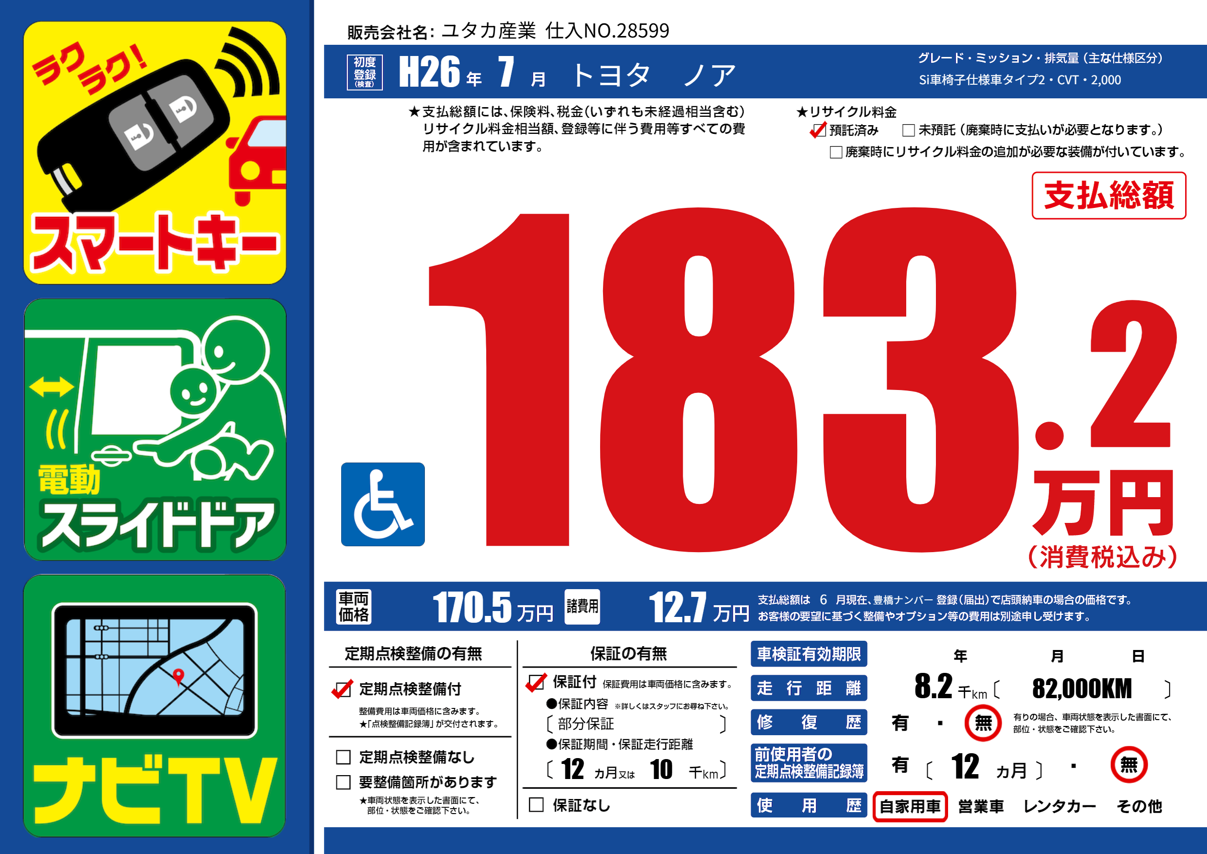 | 走行キロ | 0.8万km | 初年度登録 | H26年7月 |