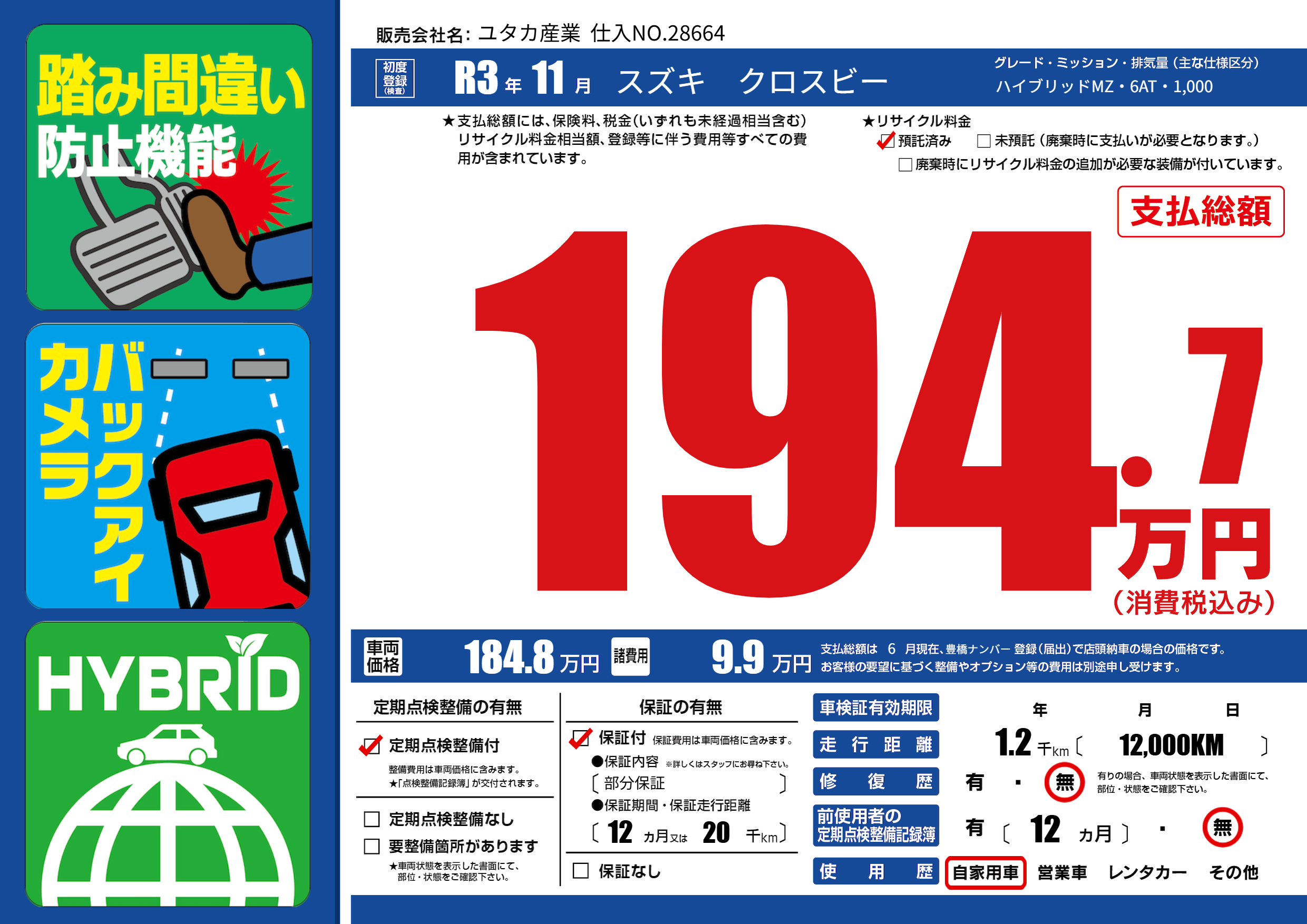 保証付き 保証内容(部分保証) 12ヶ月または(20)千kmまで |