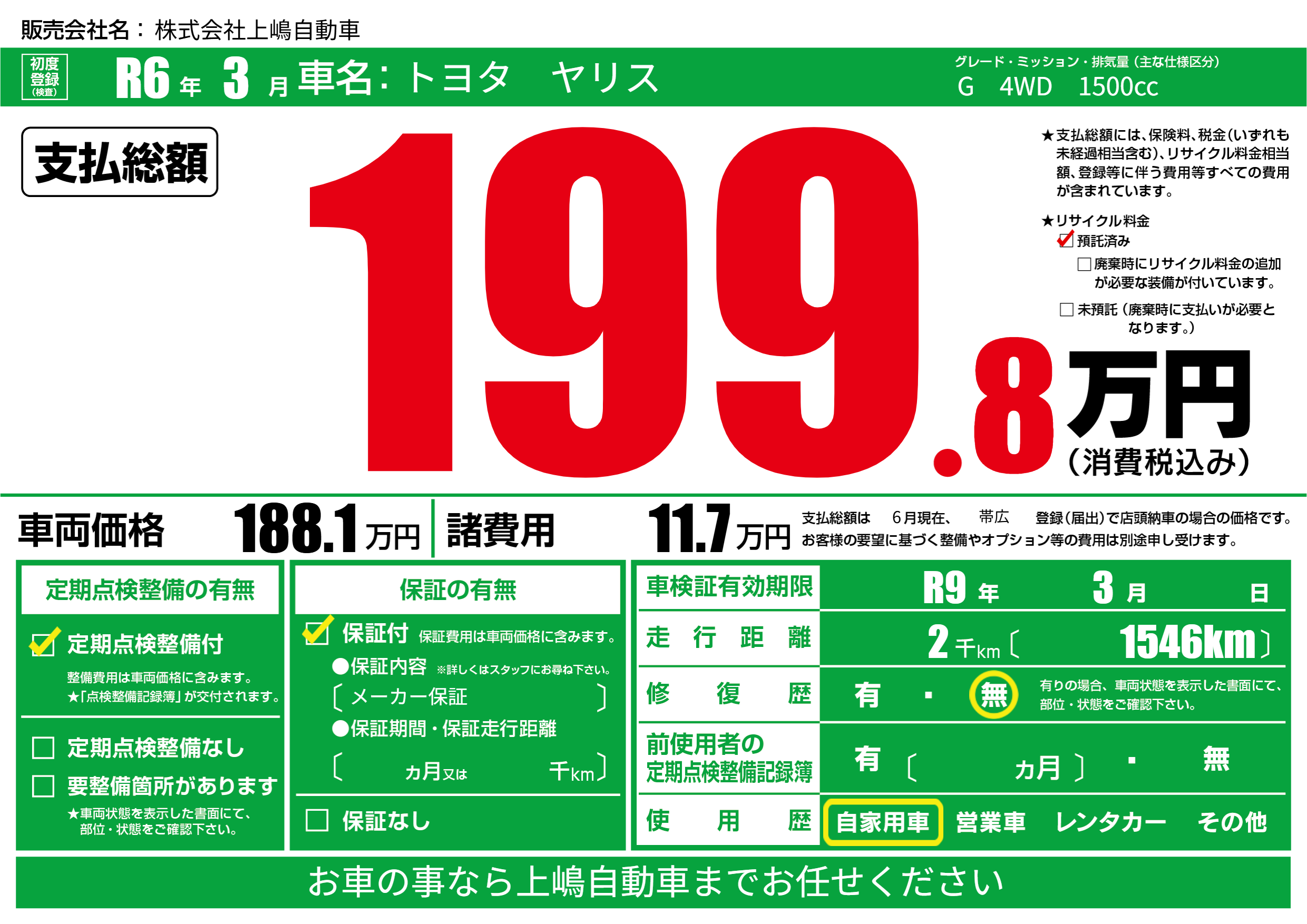 | 車検制限 | R9年 3月 - 日 | ||
