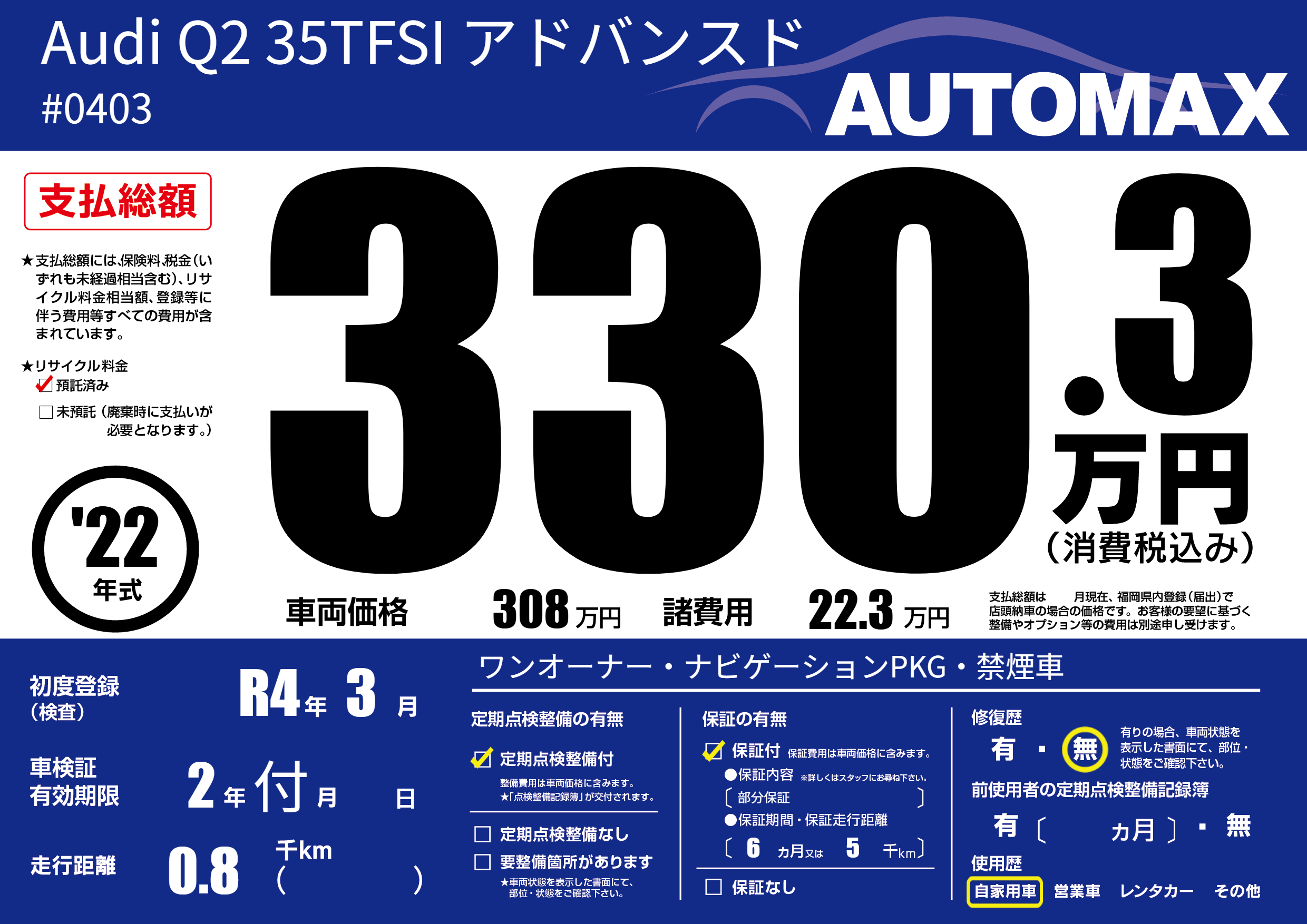 | 車名 | Audi Q2 35TFSI アドバンスド | グレード ミッション 排気量 |