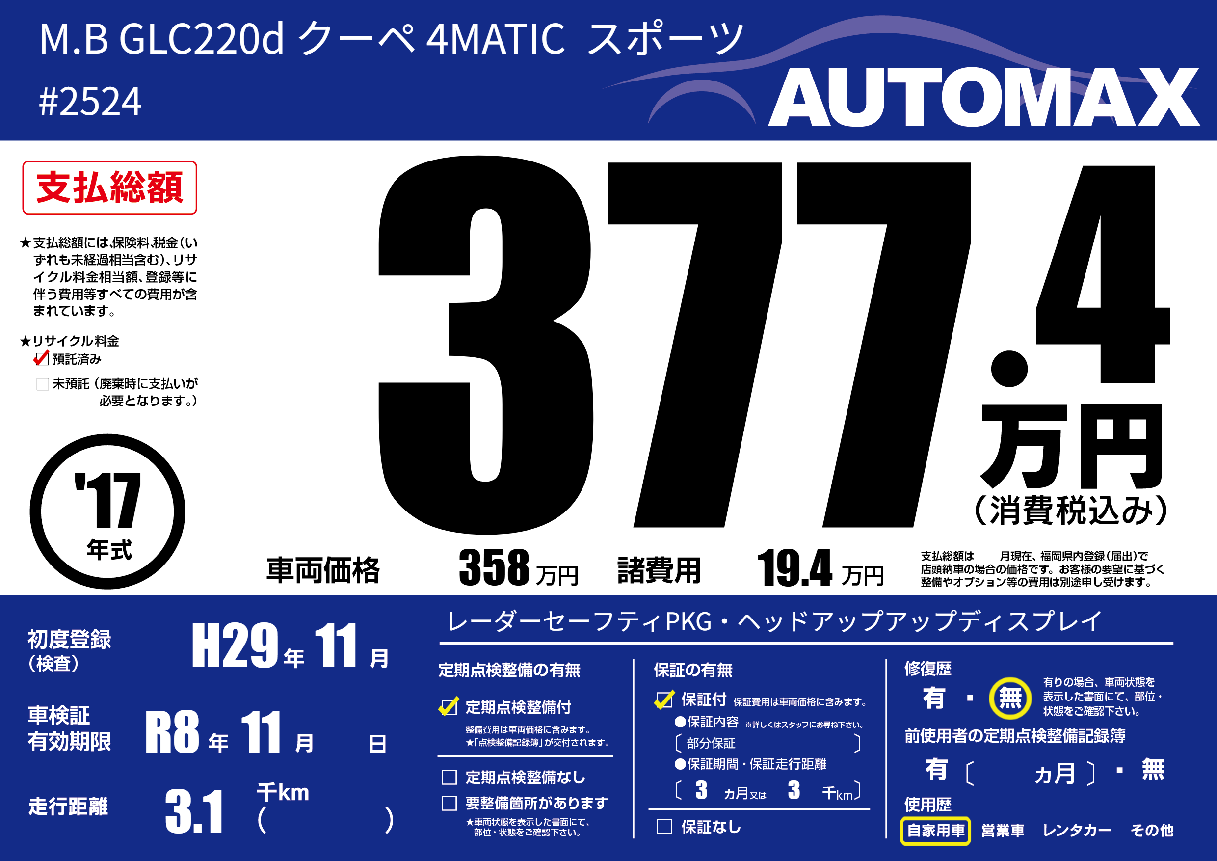 | 車名 | M.B GLC220d クーペ 4MATIC スポーツ | グレード ミッション 排気量 |