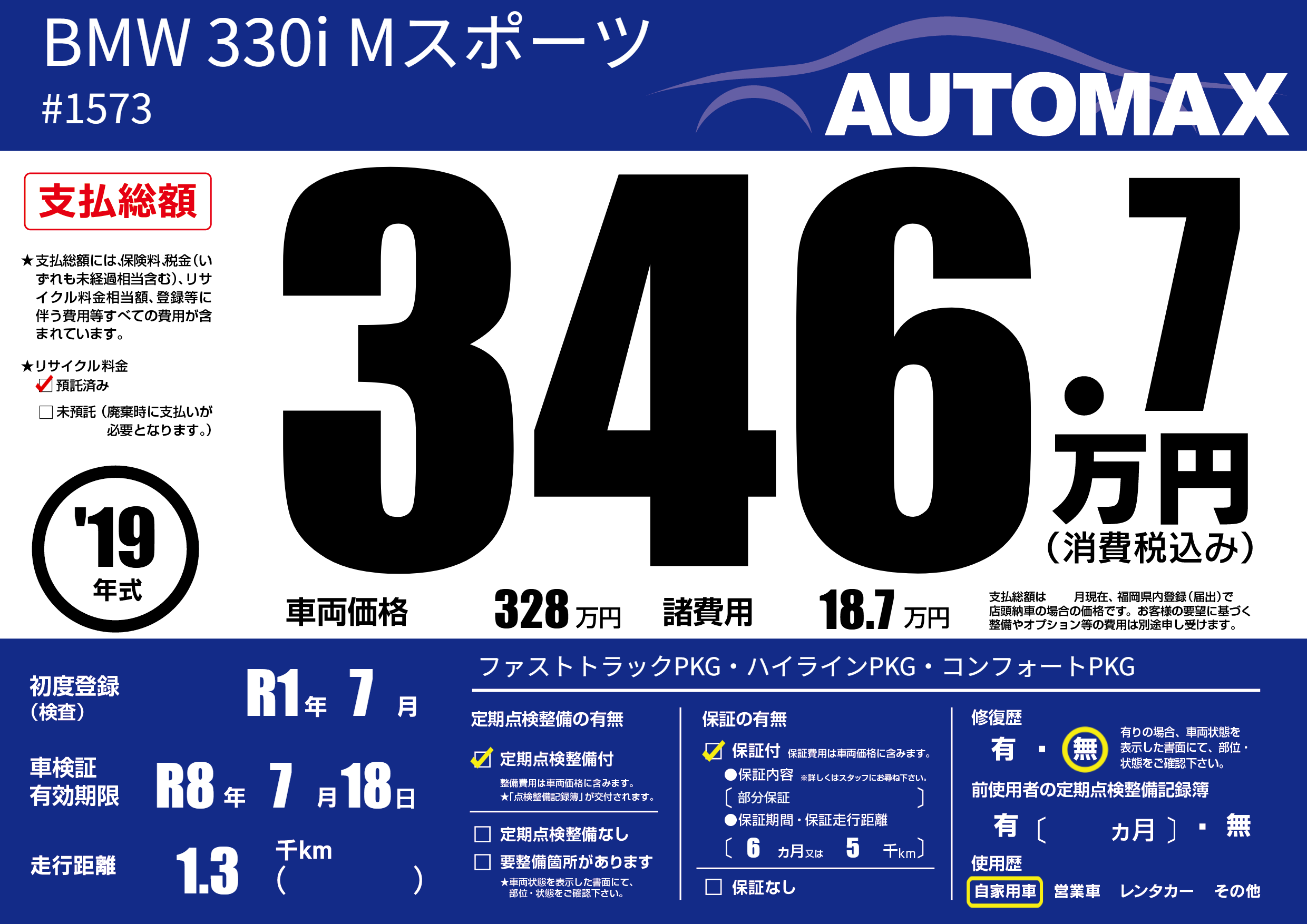 | 車名 | BMW 330i Mスポーツ | グレード ミッション 排気量 |