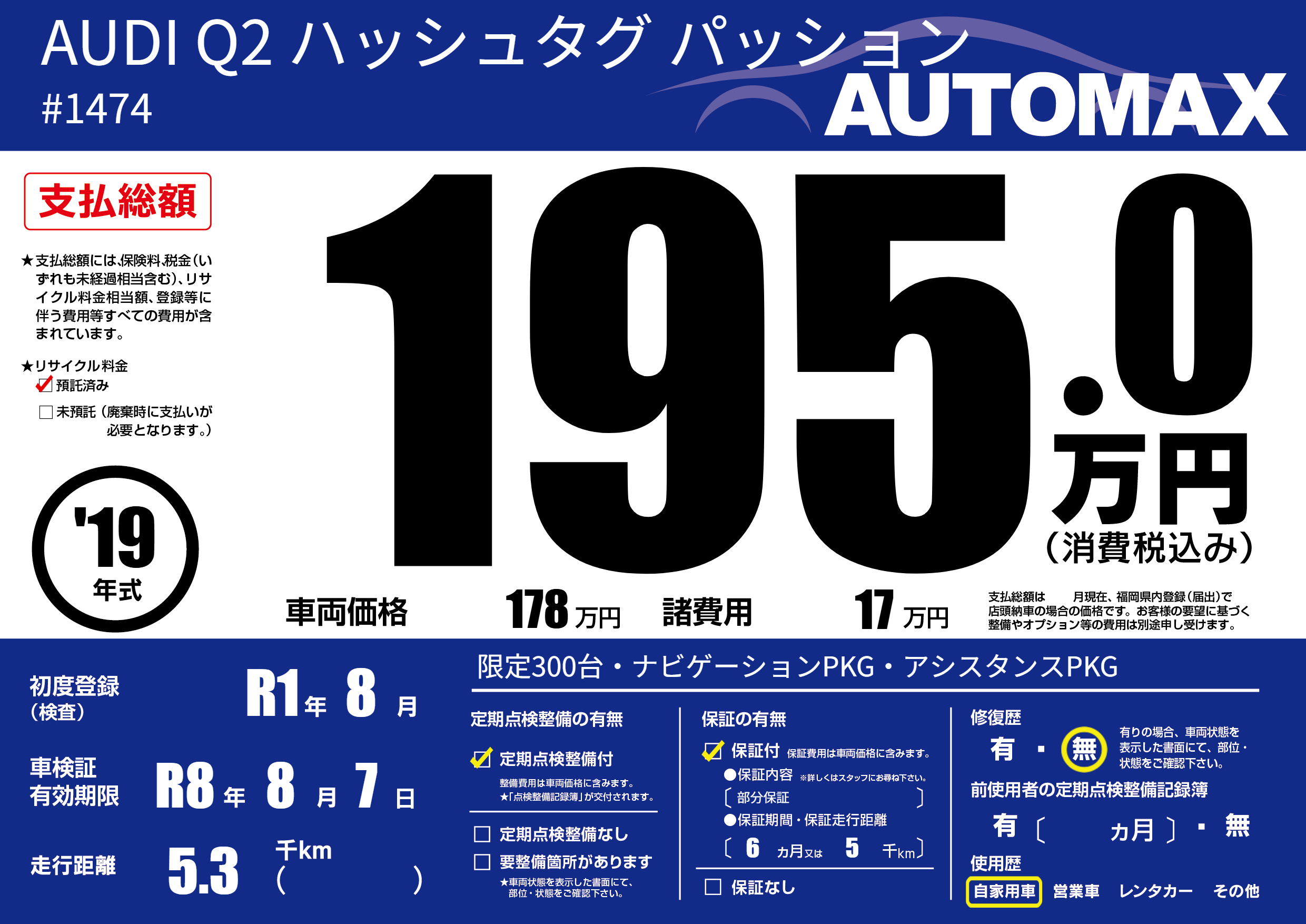 | 車名 | AUDI Q2 ハッシュタグ パッション | グレード ミッション 排気量 |