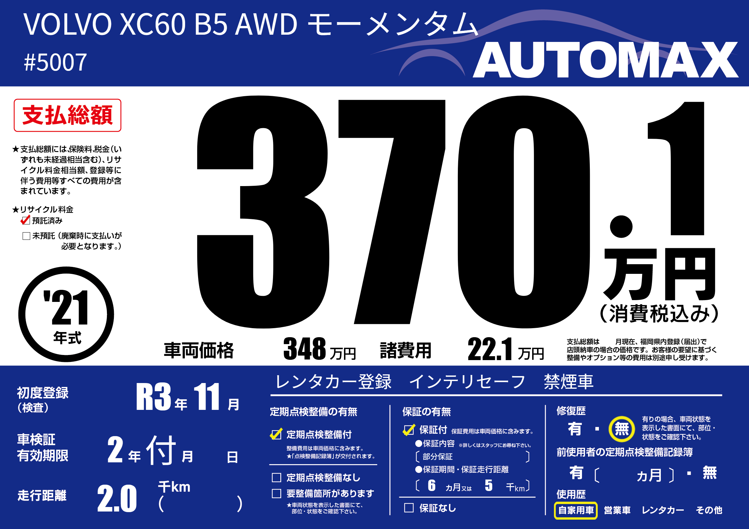| 車名 | VOLVO XC60 B5 AWD モーメンタム | グレード ミッション 排気量 |