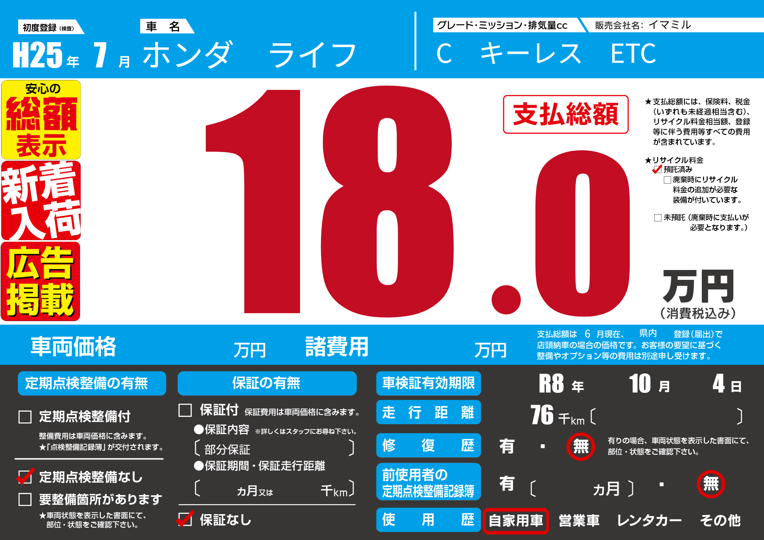 | 車名 | ホンダ ライフ | グレード ミッション 排気量 |