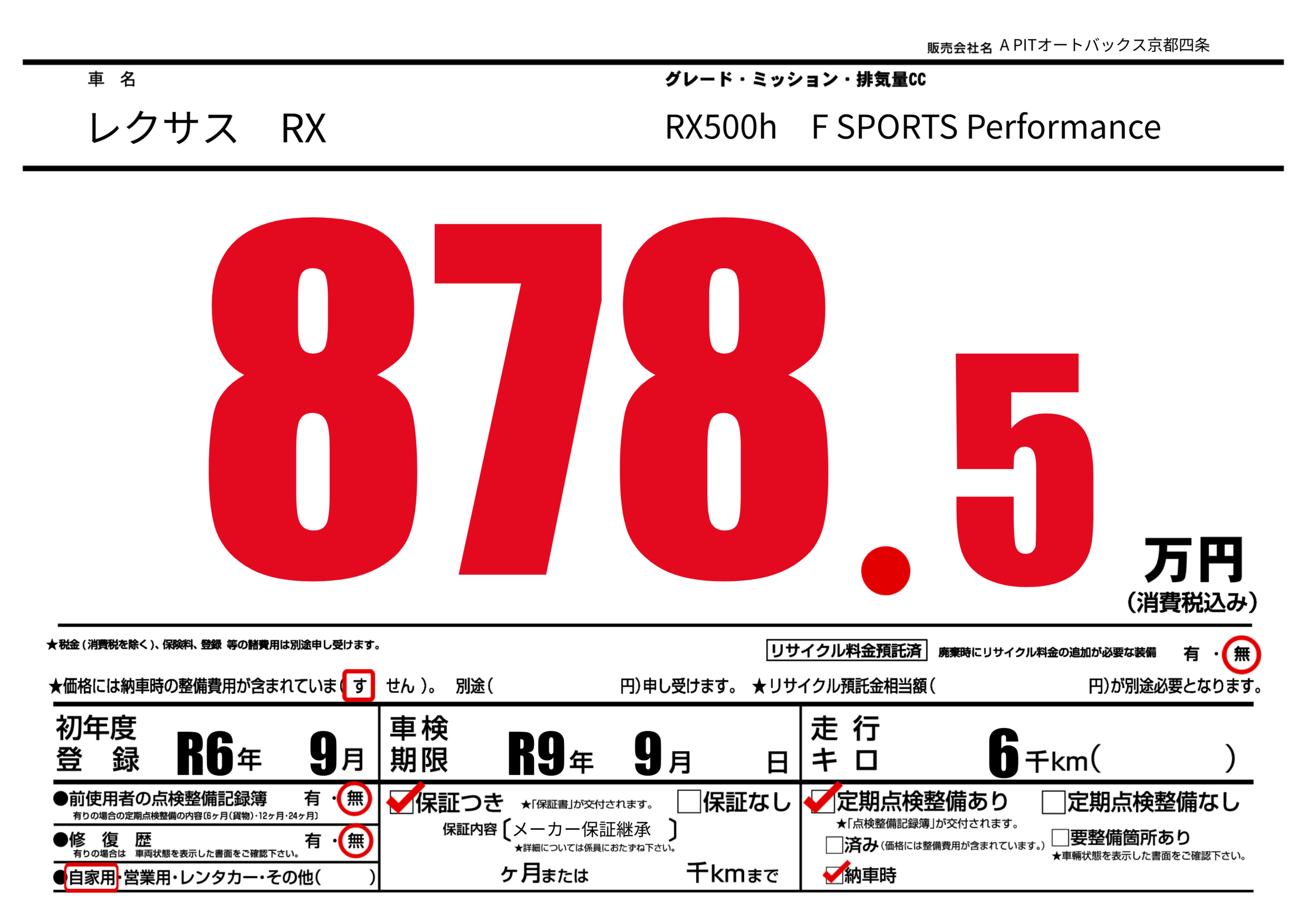 | 車検制限 | R9年 9月 - 日 | ||