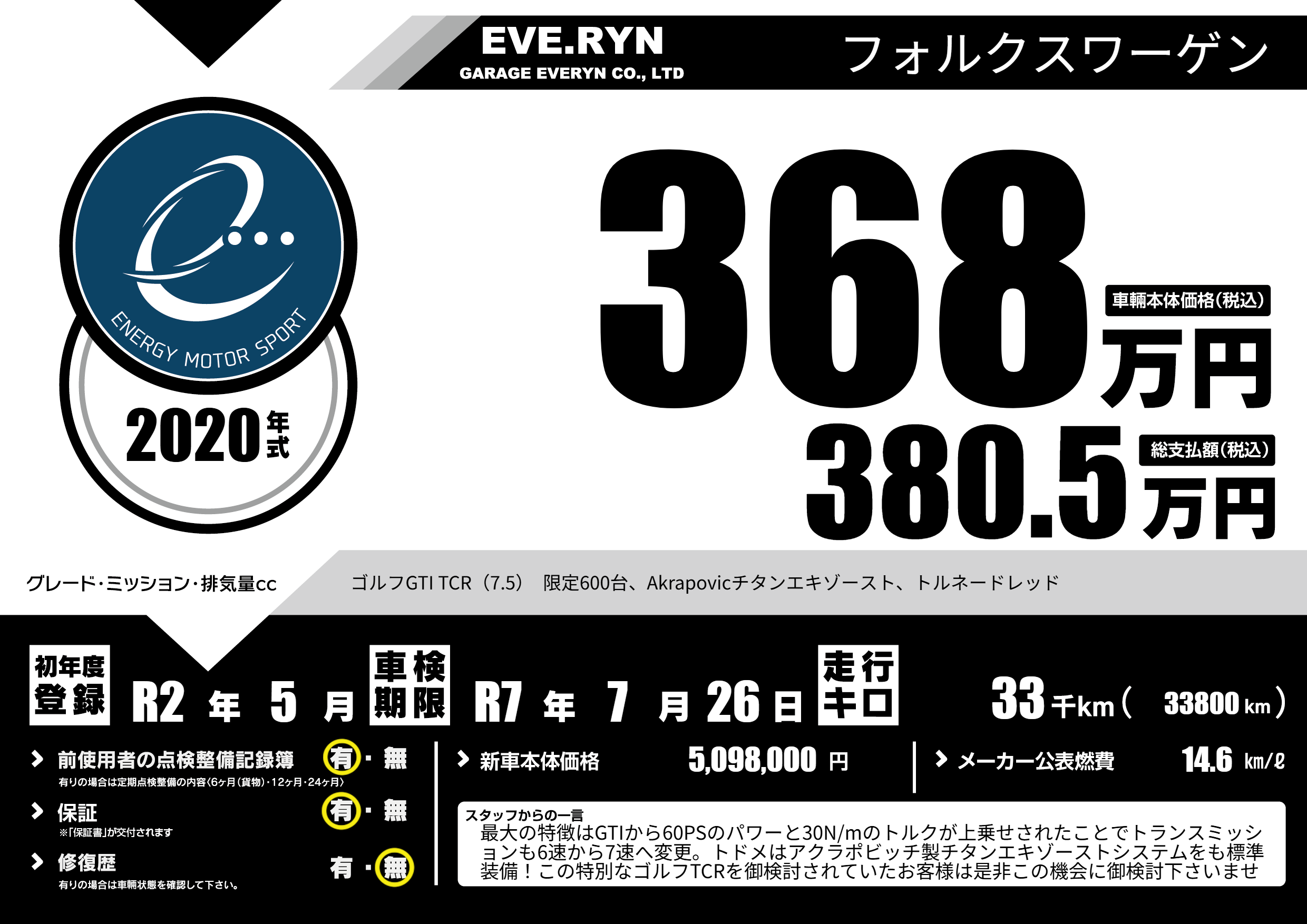 ゴルフGTI TCR(7.5) 限定600台、Akrapovicチタンエキゾースト、トルネードレッド |