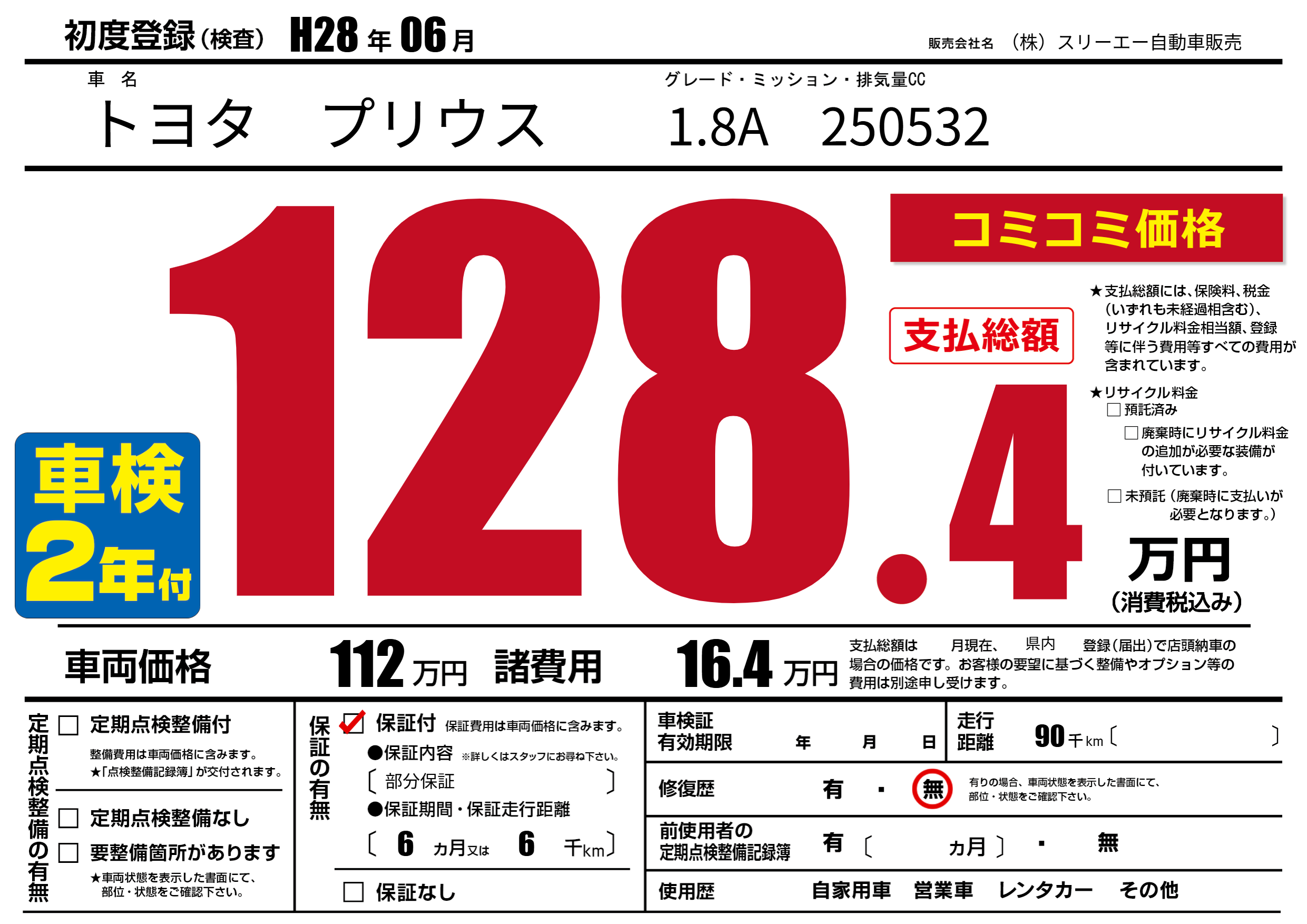 保証付き 保証内容(部分保証) 6ヶ月または(6)千kmまで |