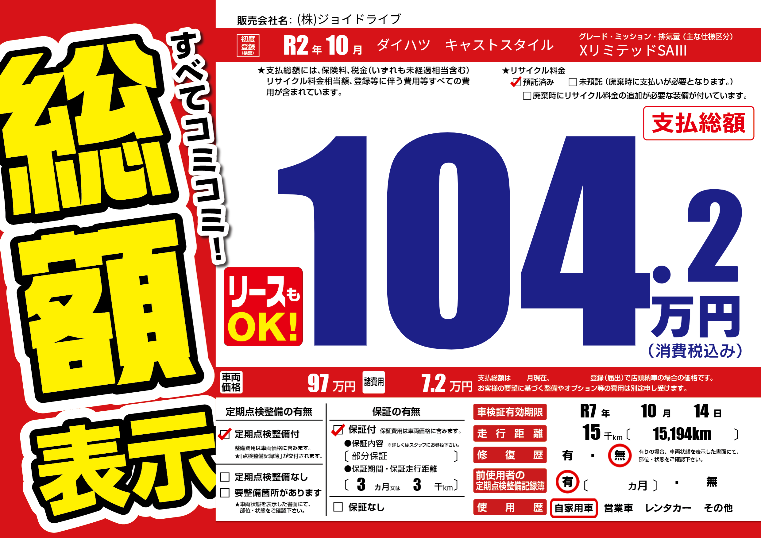 | 車名 | ダイハツ キャストスタイル | グレード ミッション 排気量 |