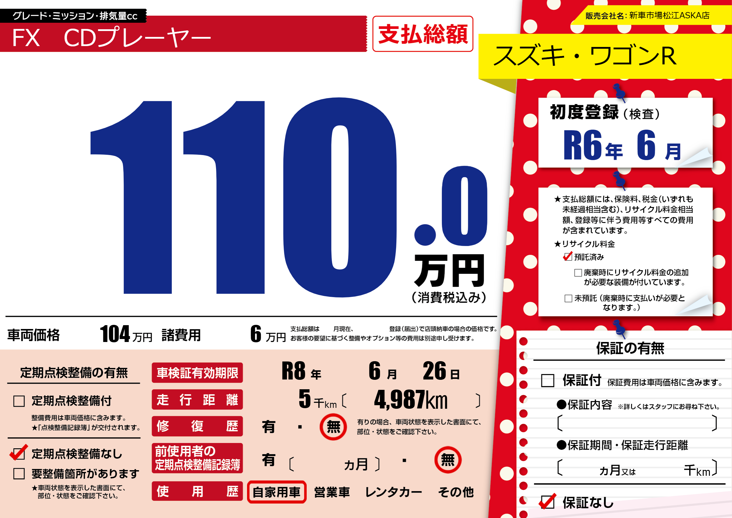 | 車名 | スズキ・ワゴンR | グレード ミッション 排気量 |