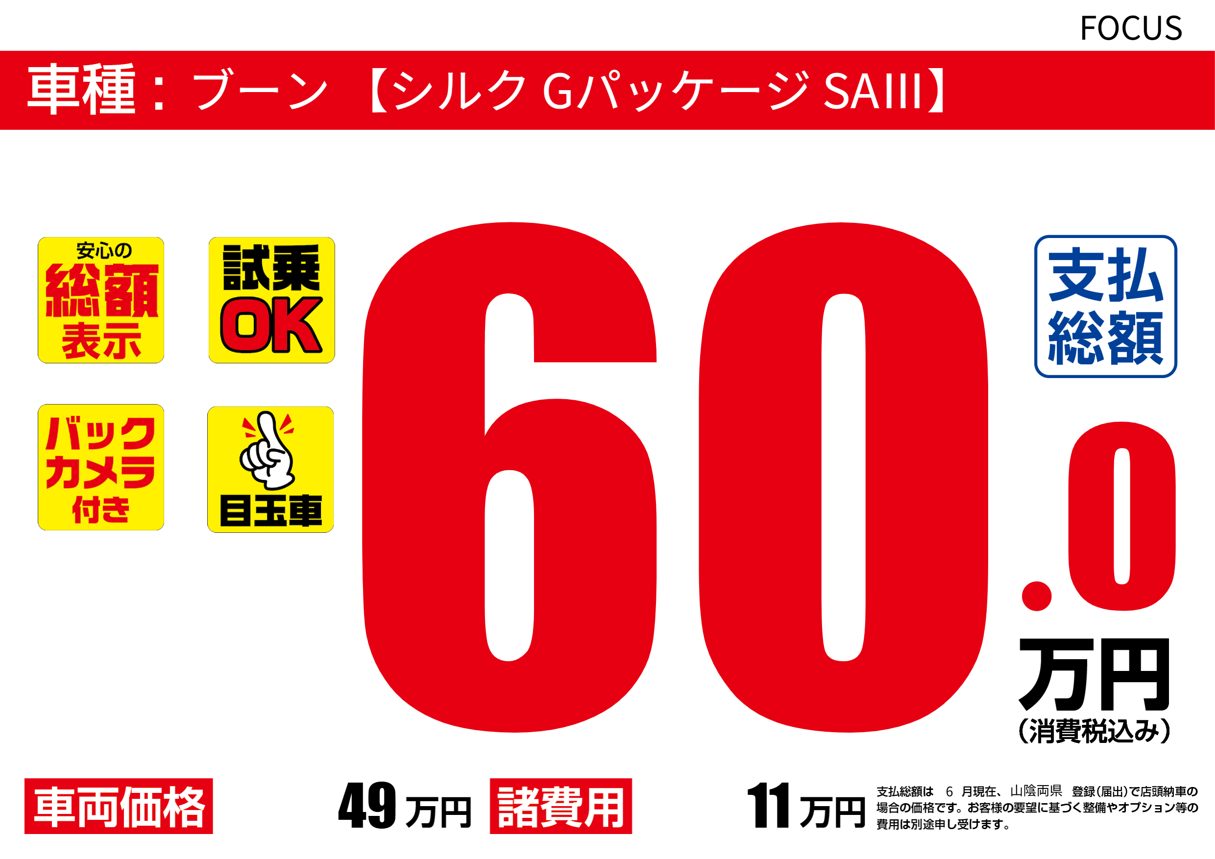 | 車名 | ブーン 【シルク Gパッケージ SAⅢ】 | グレード ミッション 排気量 |