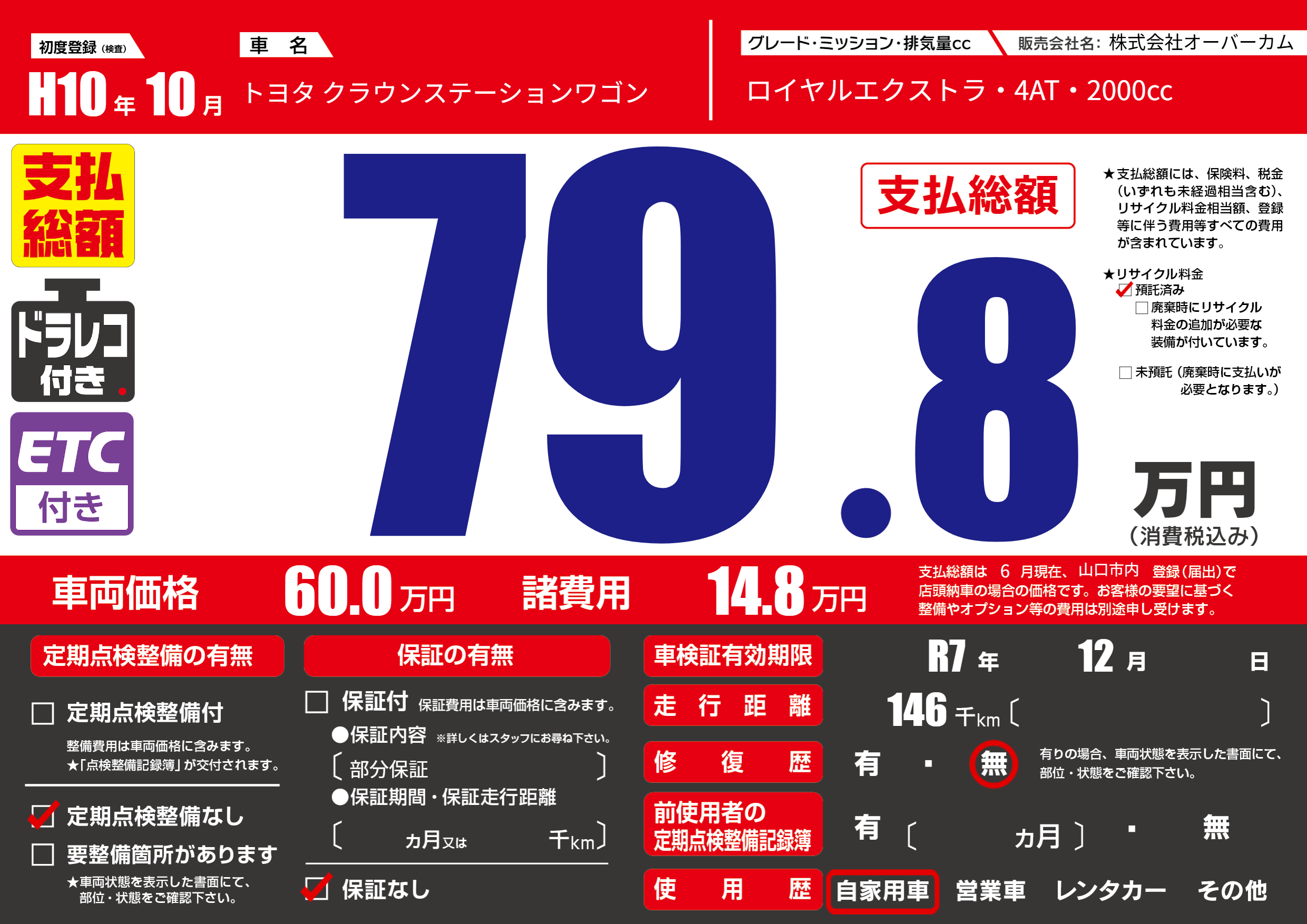 | 走行キロ | 14.6万km | 初年度登録 | H10年10月 |