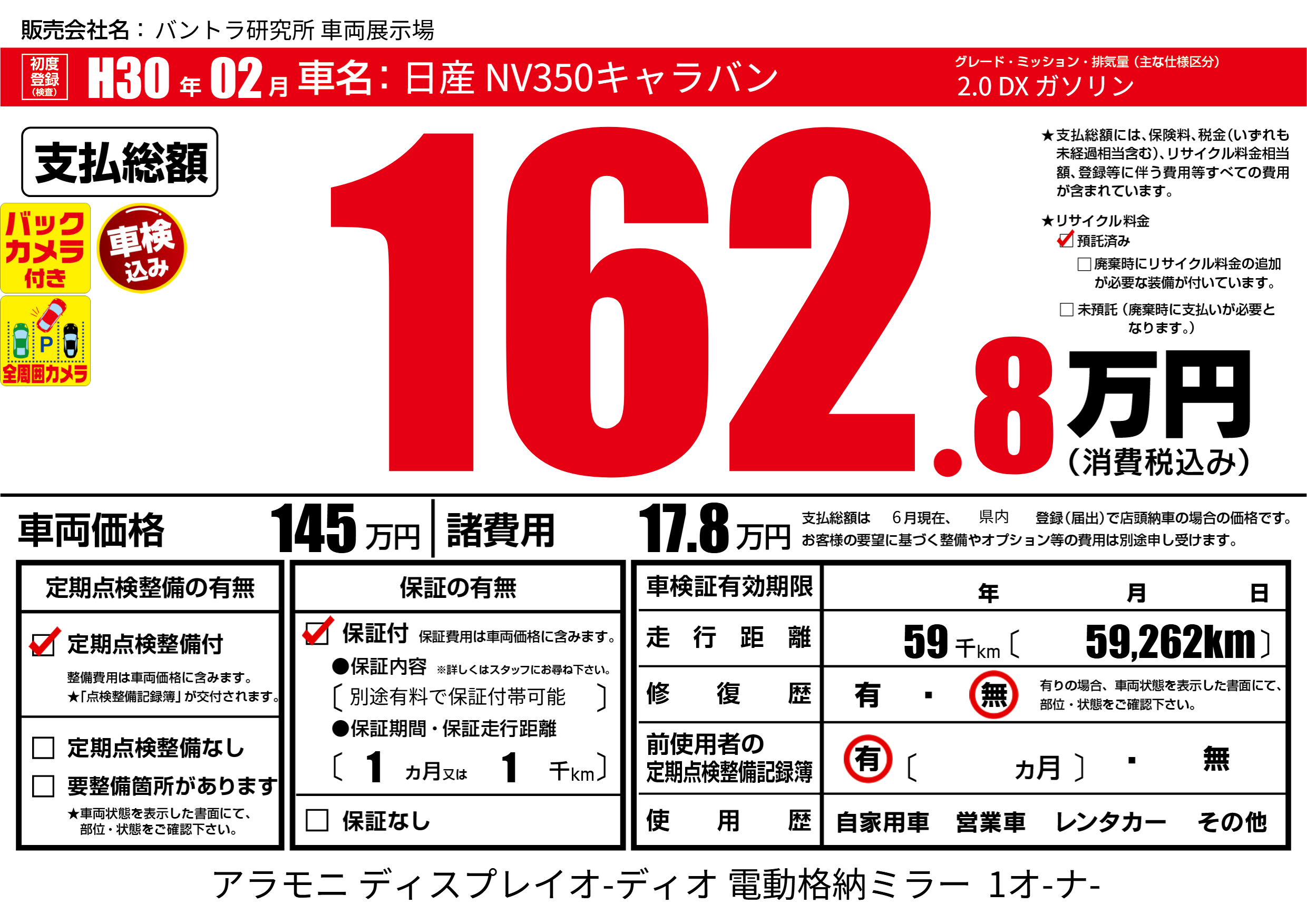 | 車名 | 日産 NV350キャラバン | グレード ミッション 排気量 |