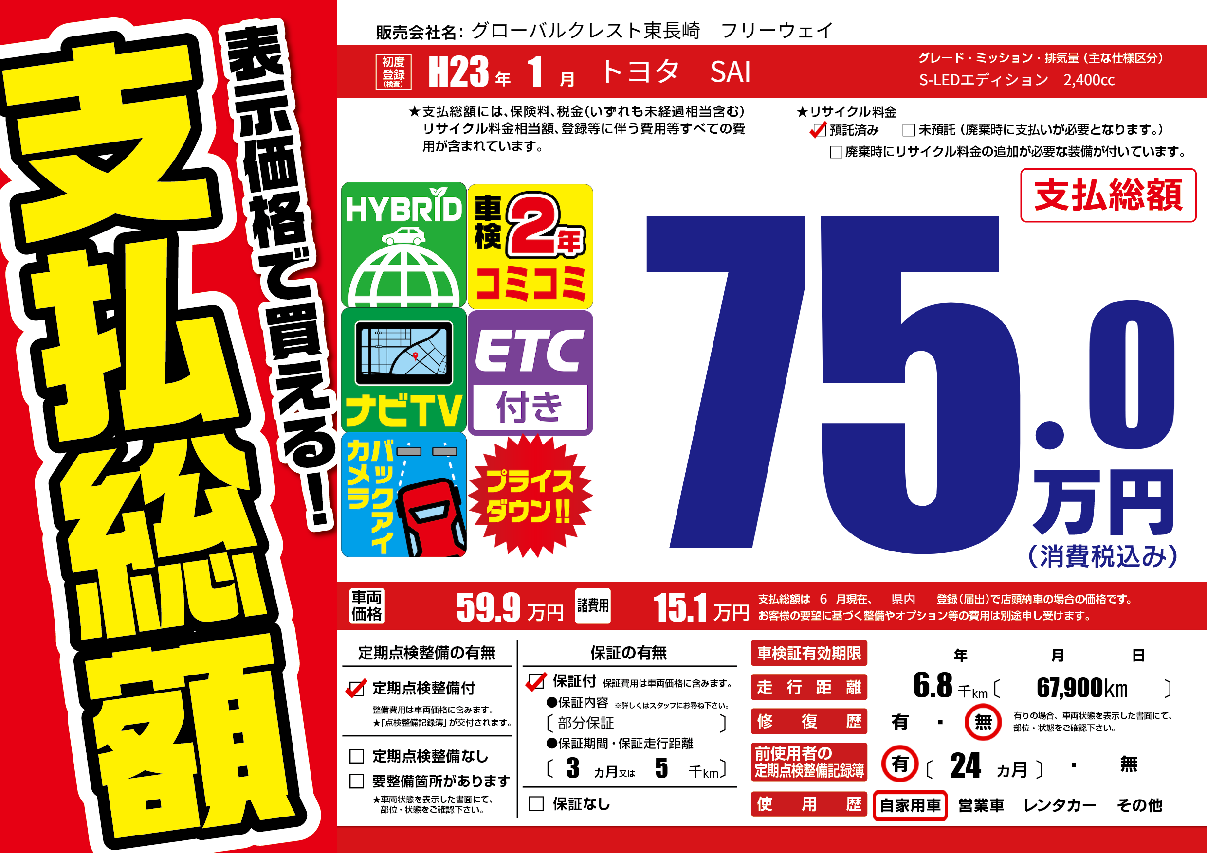 | 車名 | トヨタ SAI | グレード ミッション 排気量 |
