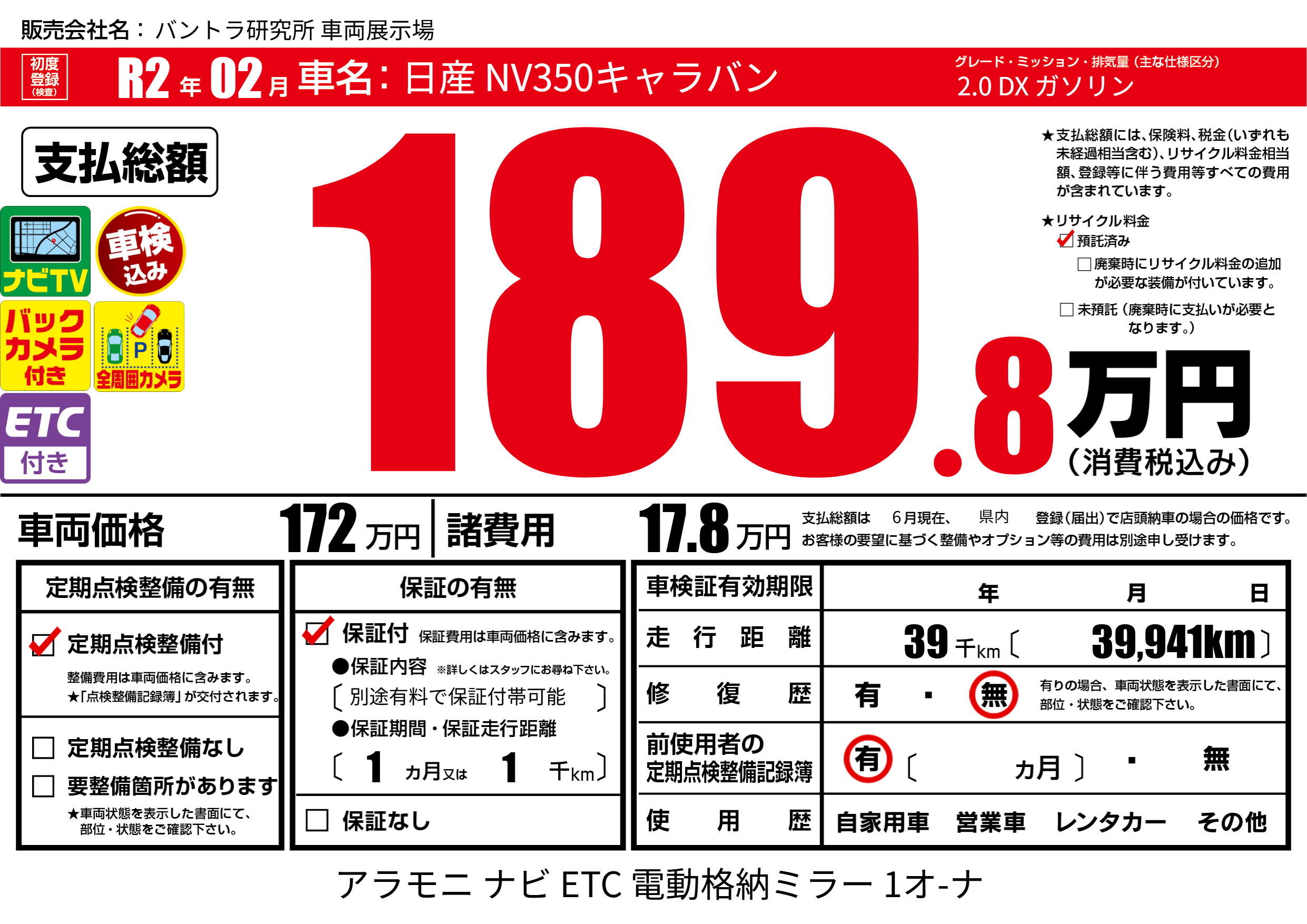 | 走行キロ | 3.9万km | 初年度登録 | R2年02月 |