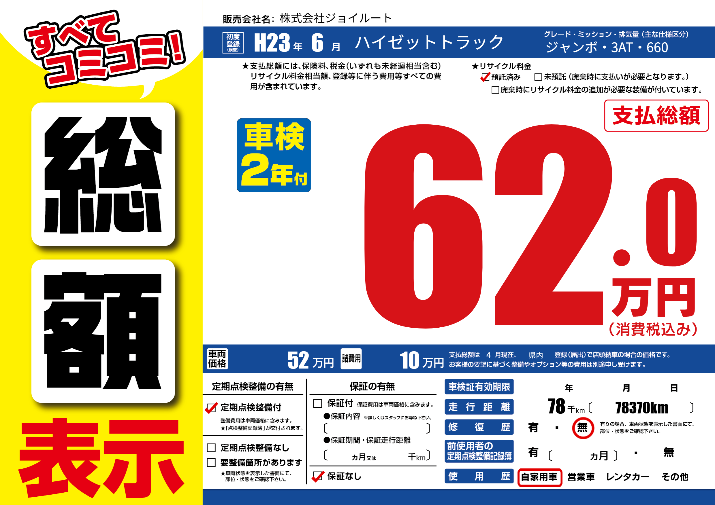 | 走行キロ | 7.8万km | 初年度登録 | H23年6月 |
