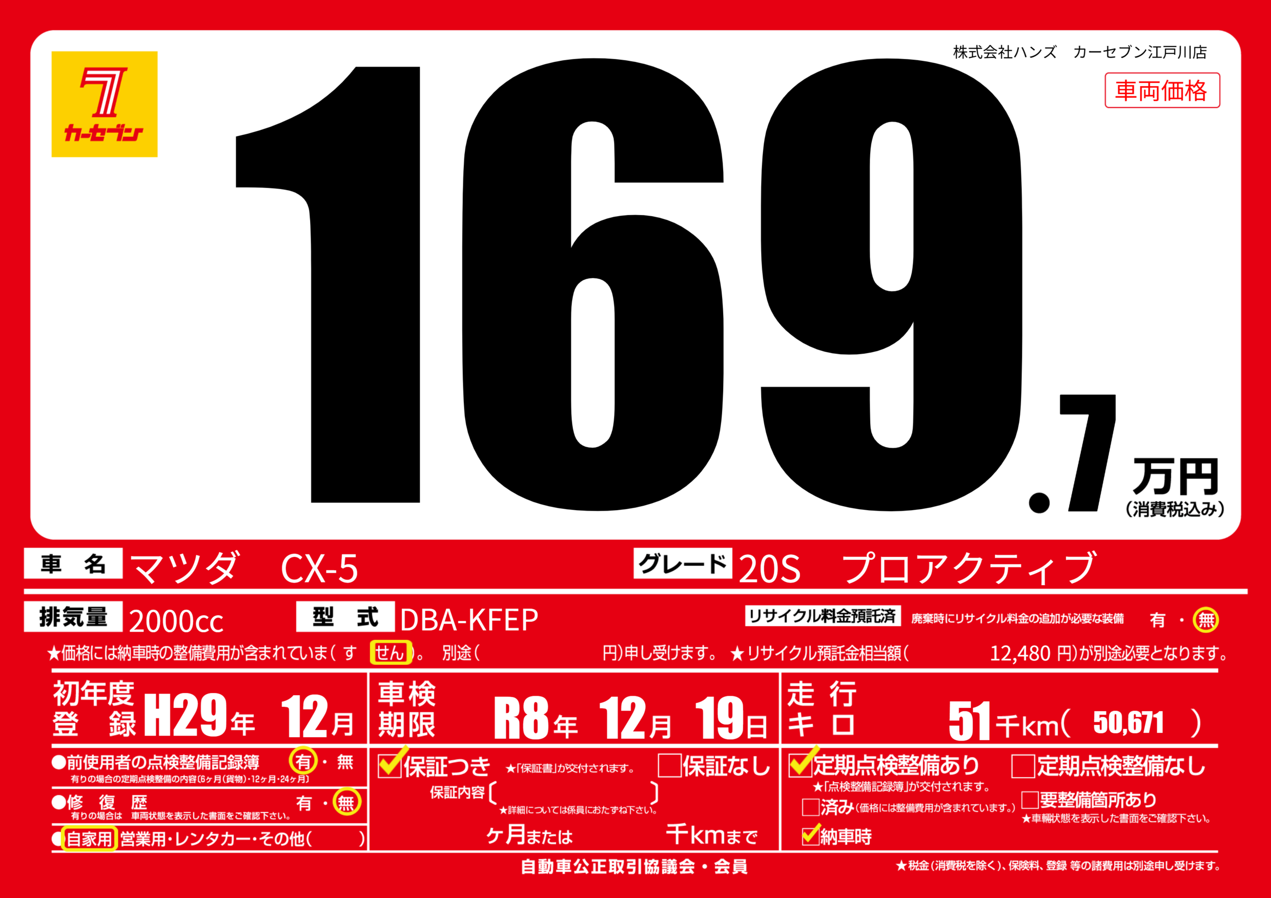 | 車名 | マツダ CX-5 | グレード ミッション 排気量 |