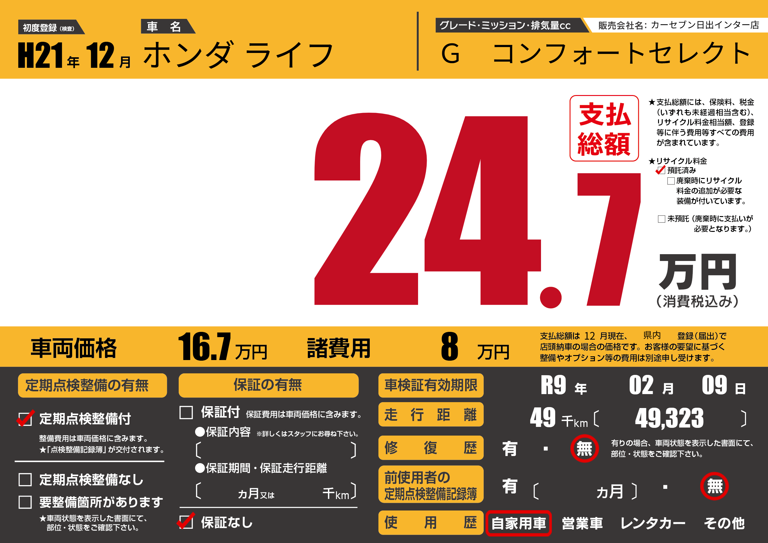 | 走行キロ | 4.9万km | 初年度登録 | H21年12月 |