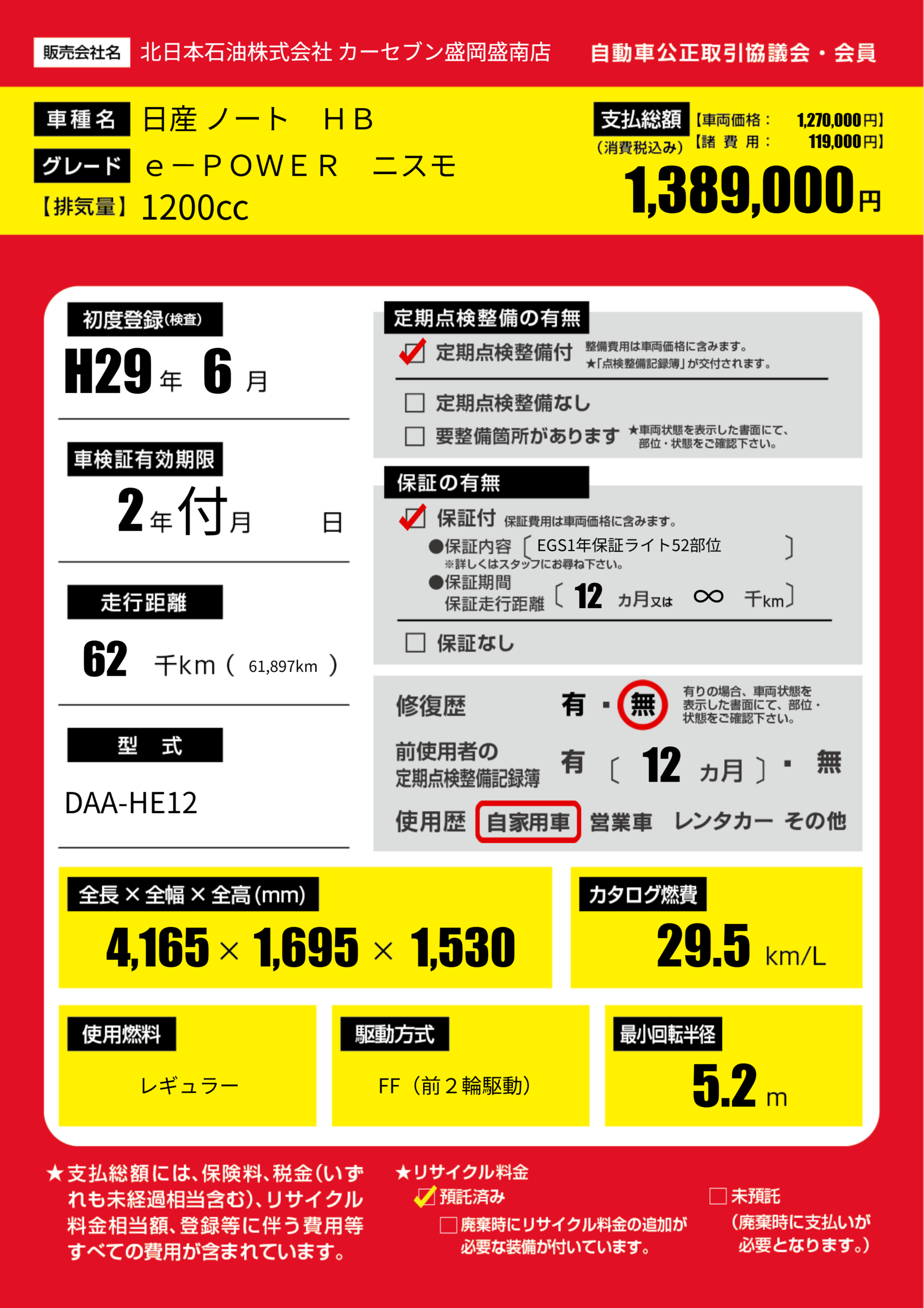 | 車名 | 日産 ノート HB | グレード ミッション 排気量 |