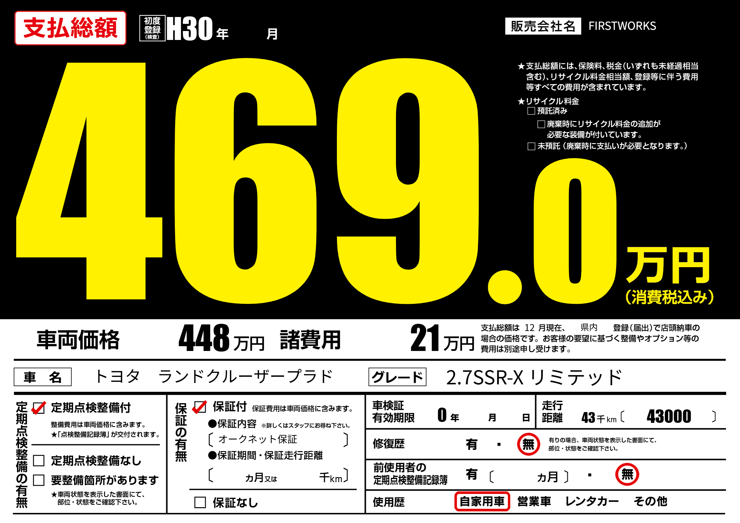 | 車名 | トヨタ ランドクルーザープラド | グレード ミッション 排気量 |