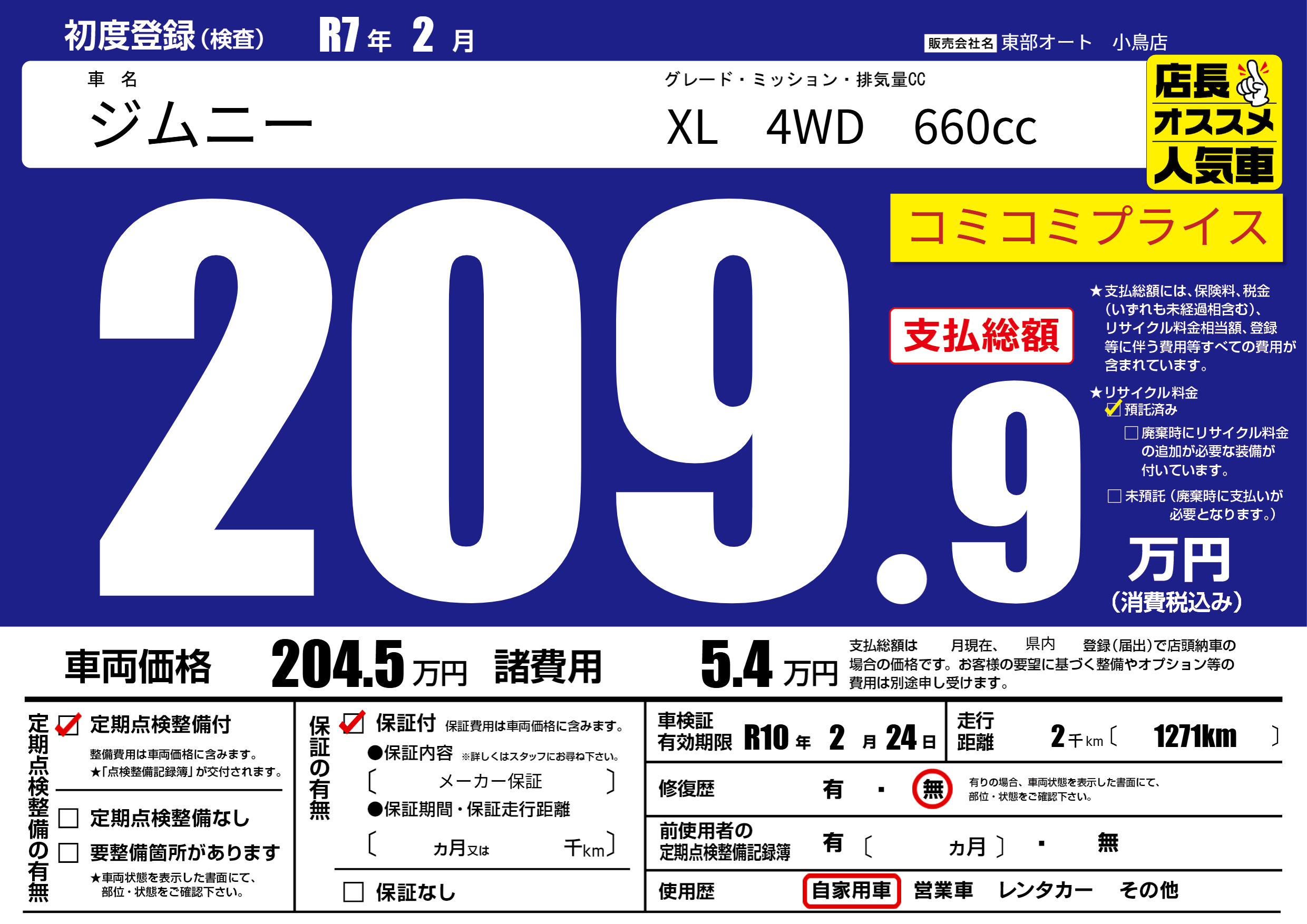 | 車名 | ジムニー | グレード ミッション 排気量 |