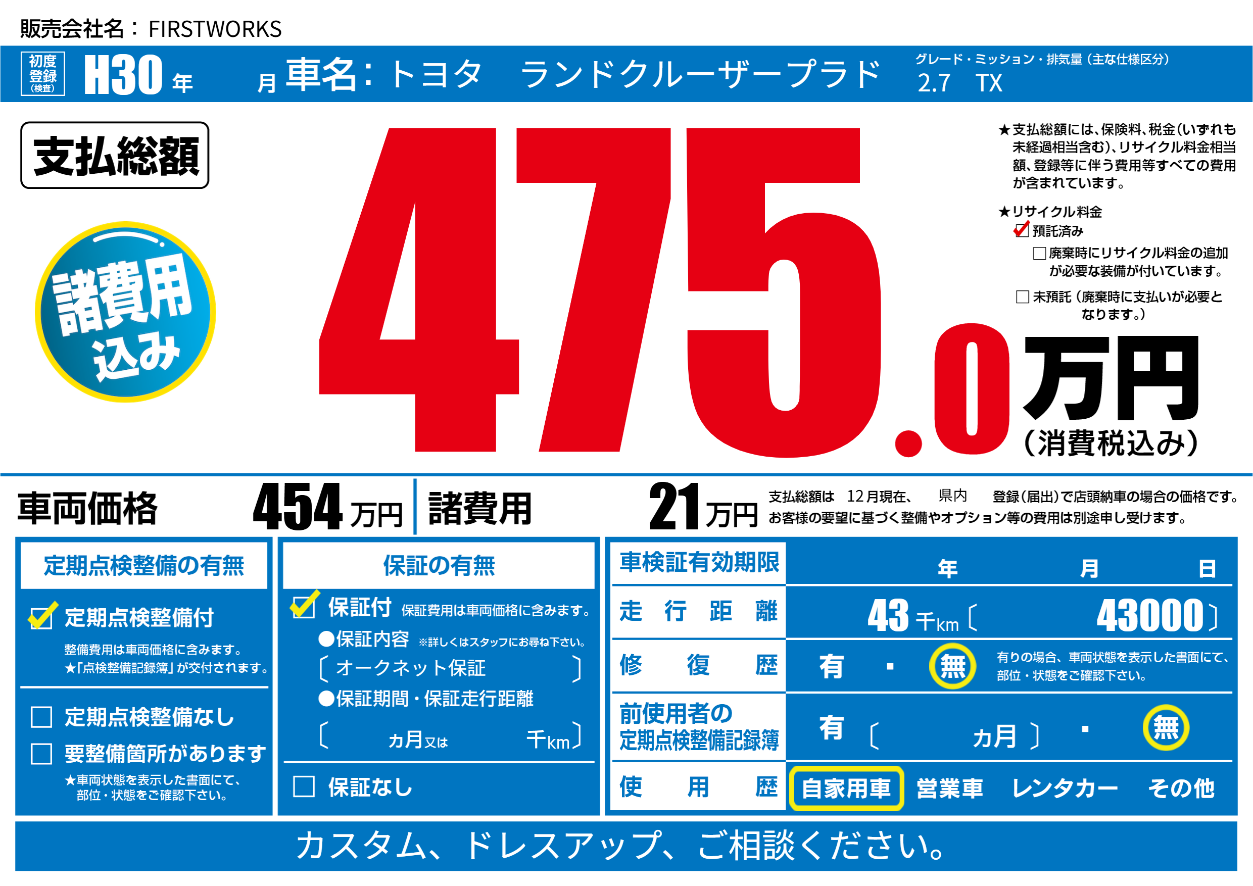 | 車名 | トヨタ ランドクルーザープラド | グレード ミッション 排気量 |