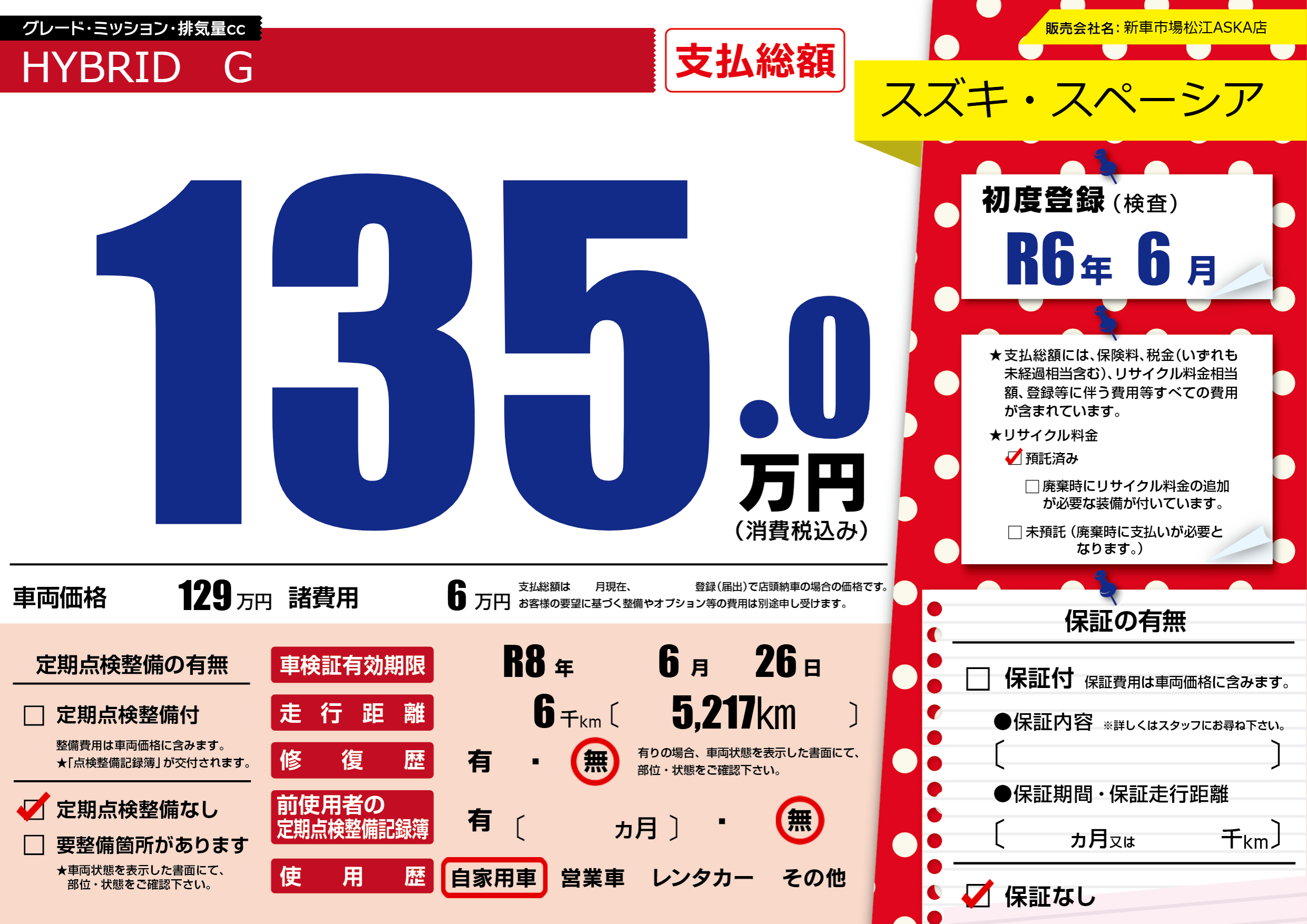 | 走行キロ | 0.6万km | 初年度登録 | R6年6月 |