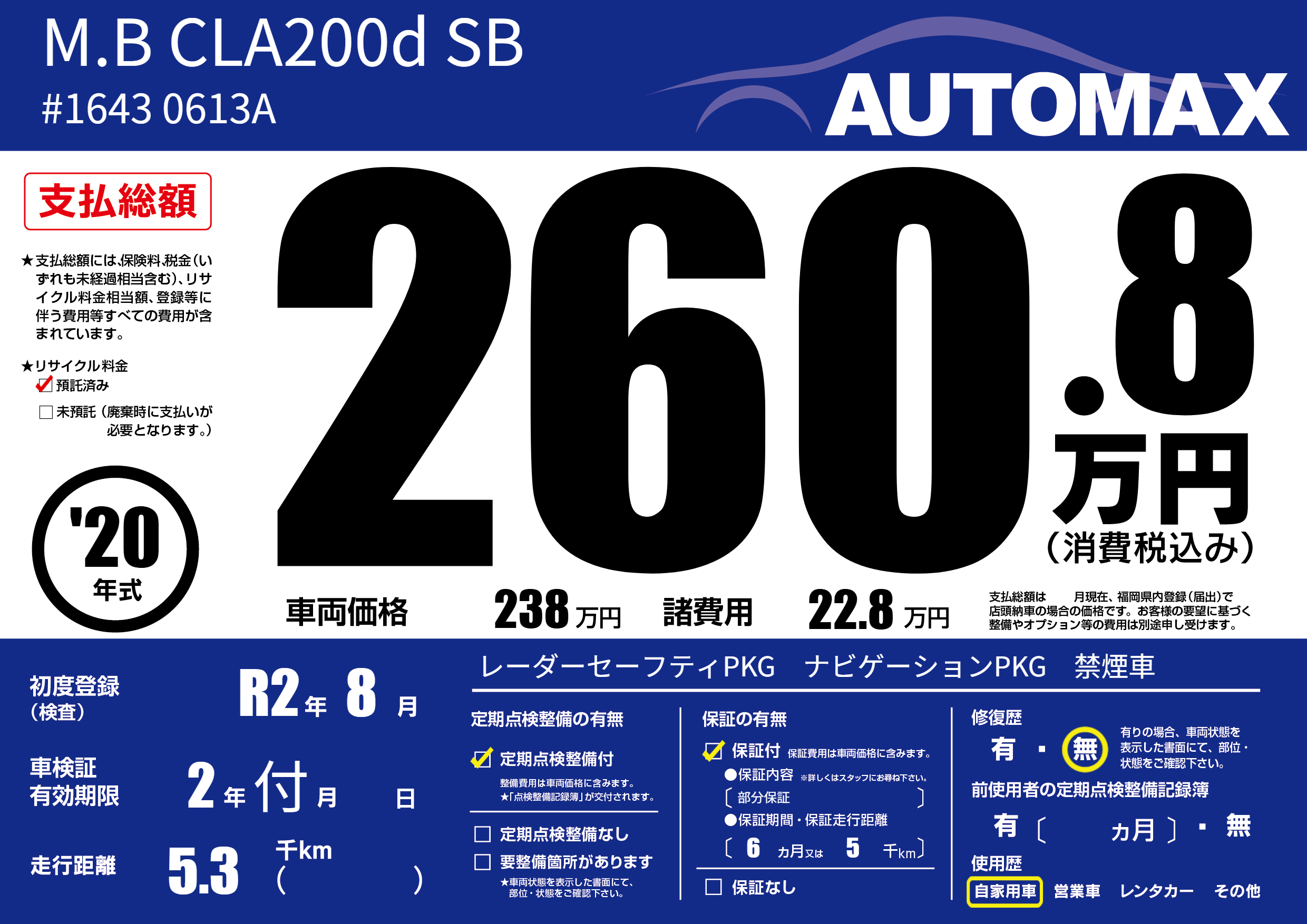| 車名 | M.B CLA200d SB | グレード ミッション 排気量 |