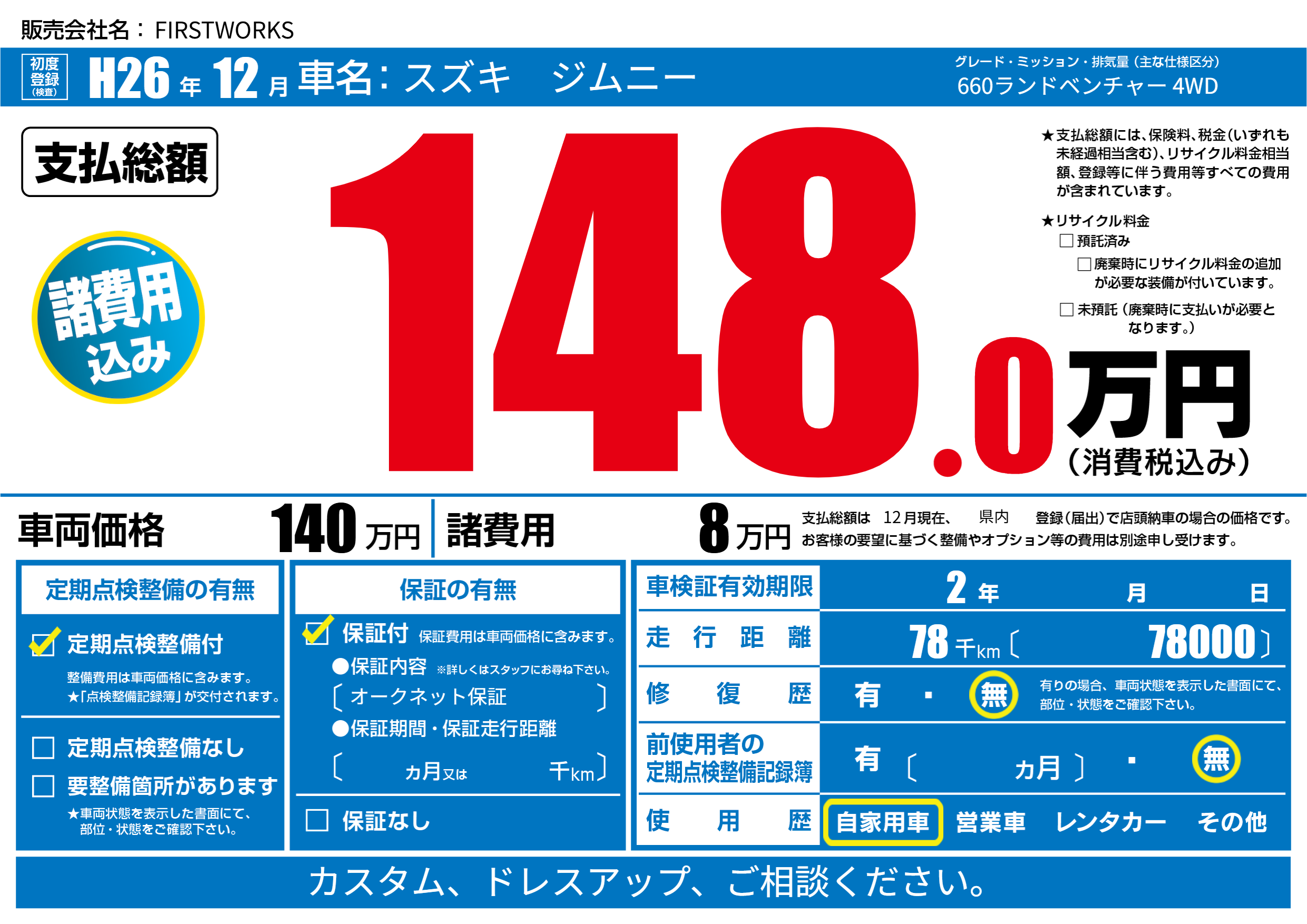 | 走行キロ | 7.8万km | 初年度登録 | H26年12月 |