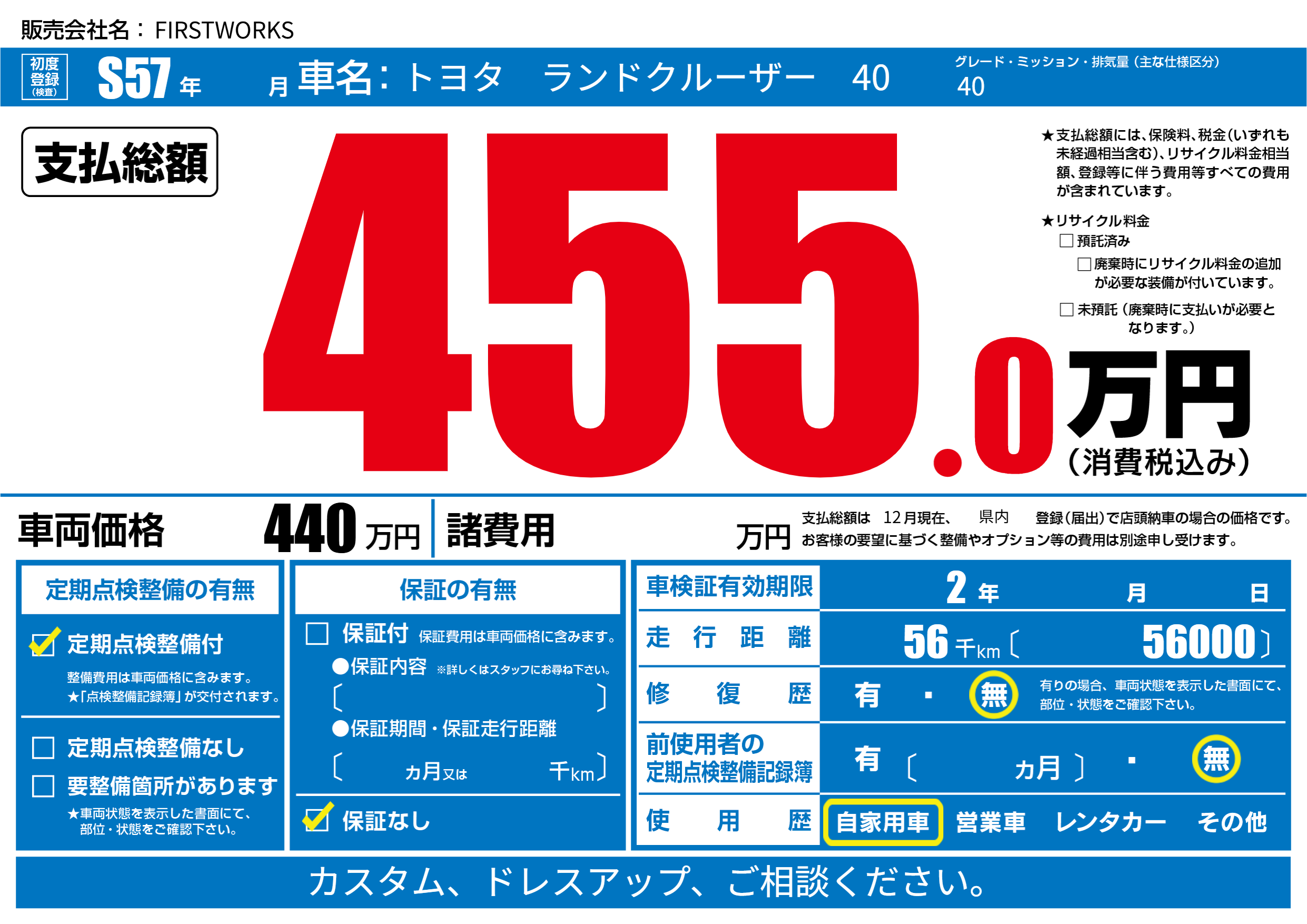 | 車名 | トヨタ ランドクルーザー 40 | グレード ミッション 排気量 |
