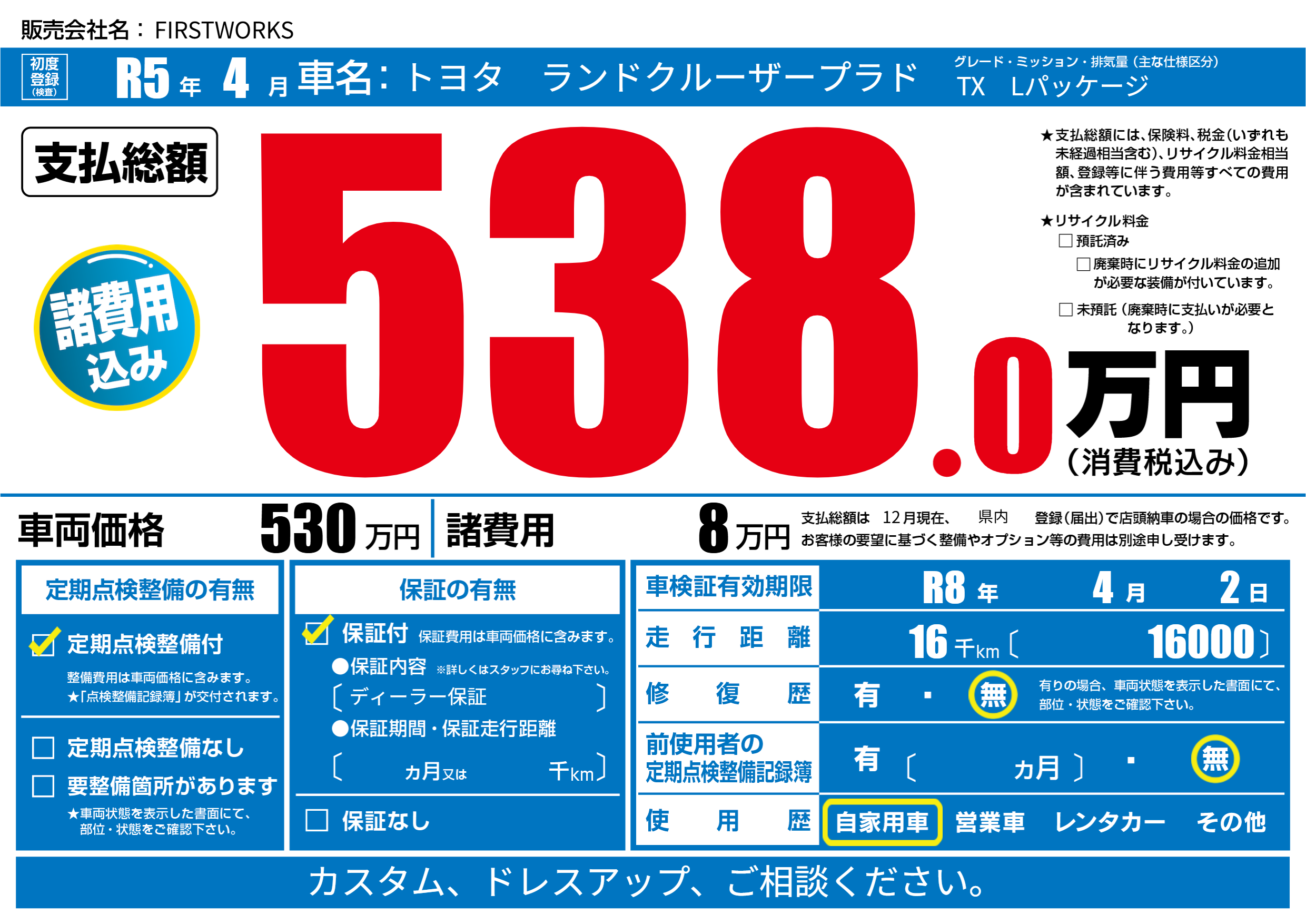 | 車名 | トヨタ ランドクルーザープラド | グレード ミッション 排気量 |
