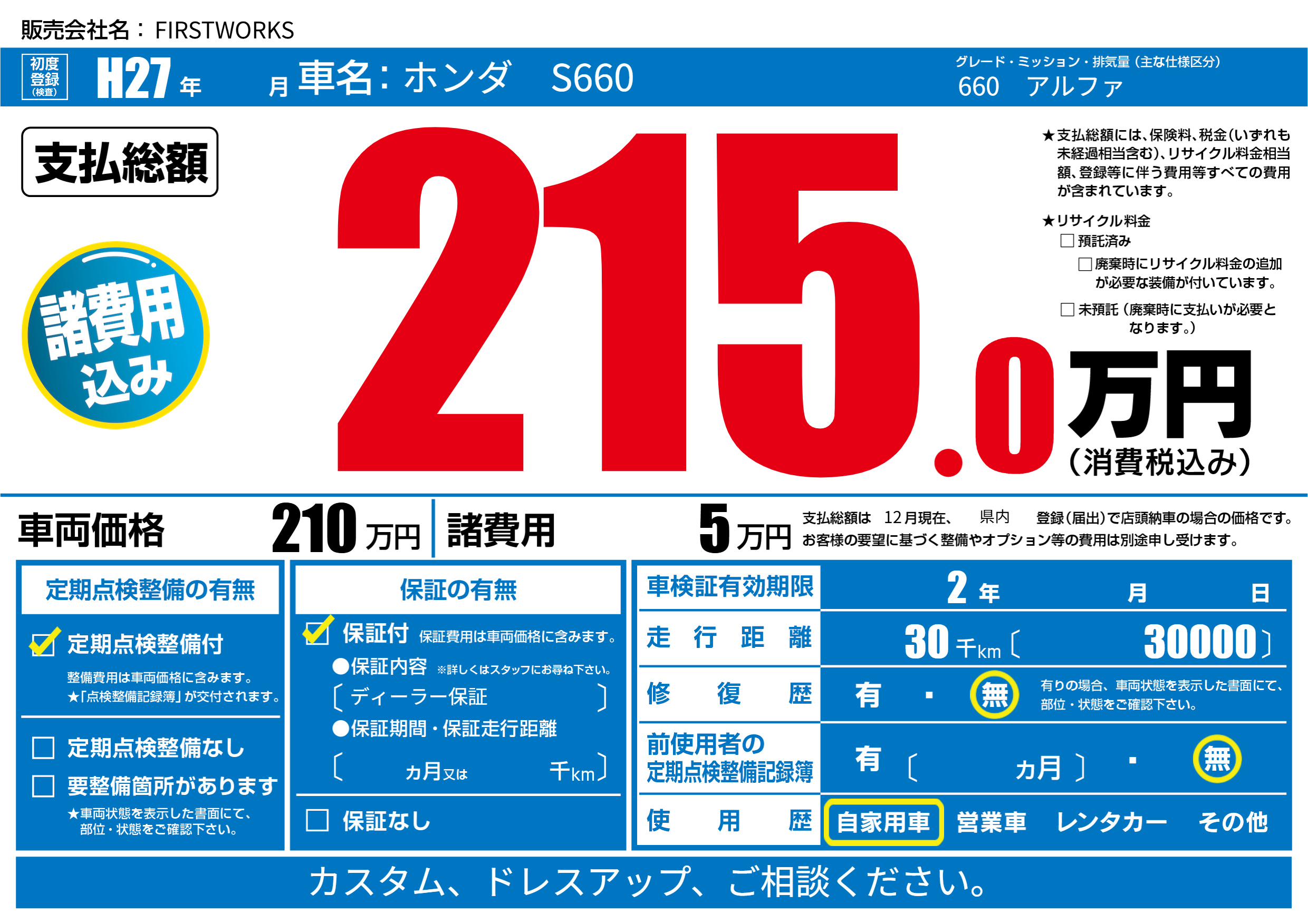| 走行キロ | 3万km | 初年度登録 | H27年---月 |