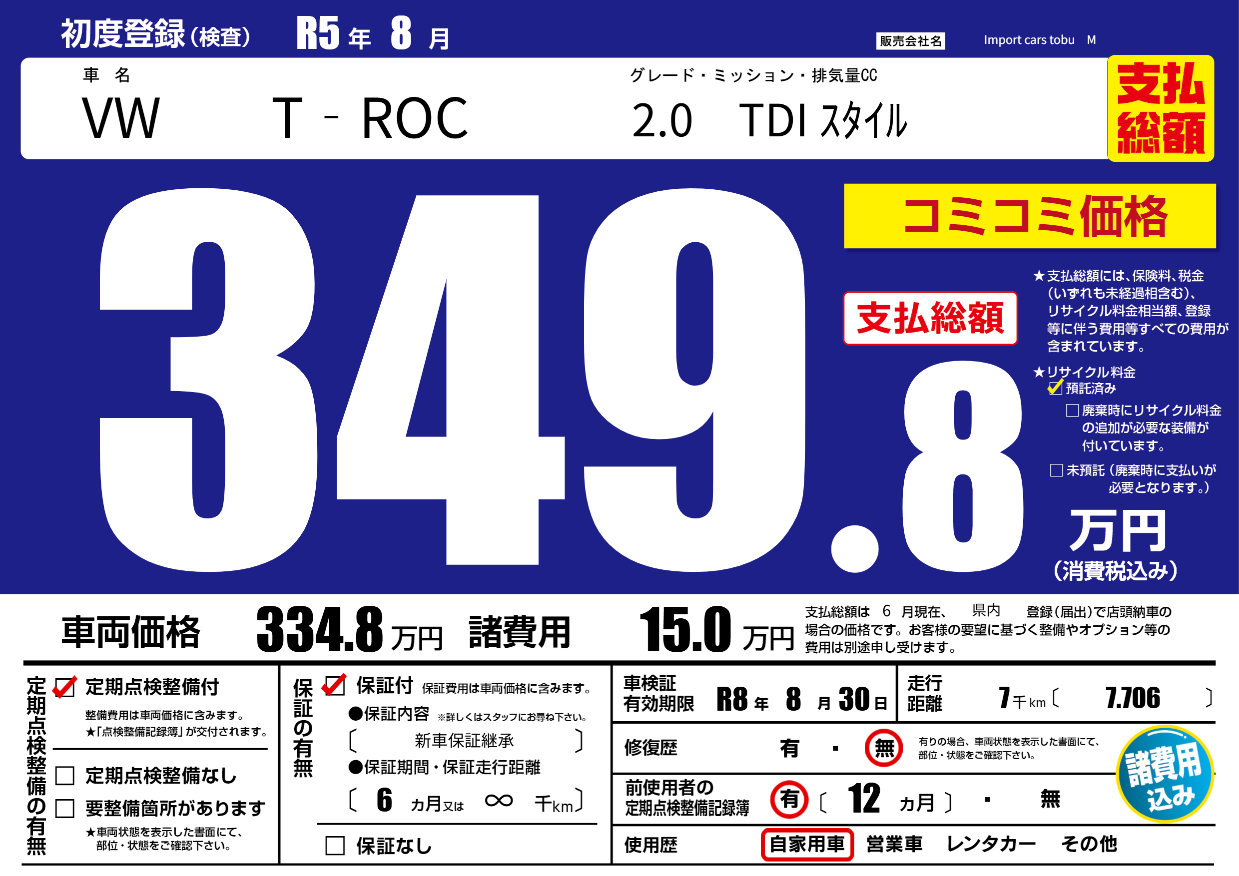 | 車名 | VW T‐ROC | グレード ミッション 排気量 |