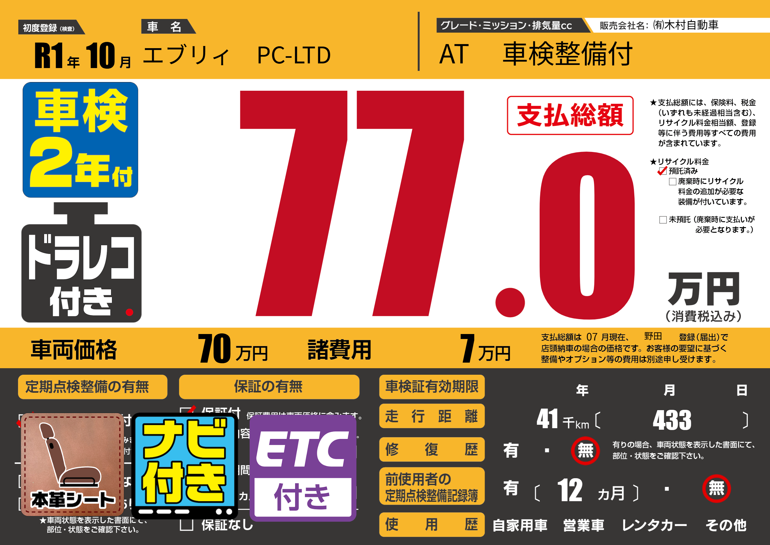 | 車名 | エブリィ PC-LTD | グレード ミッション 排気量 |