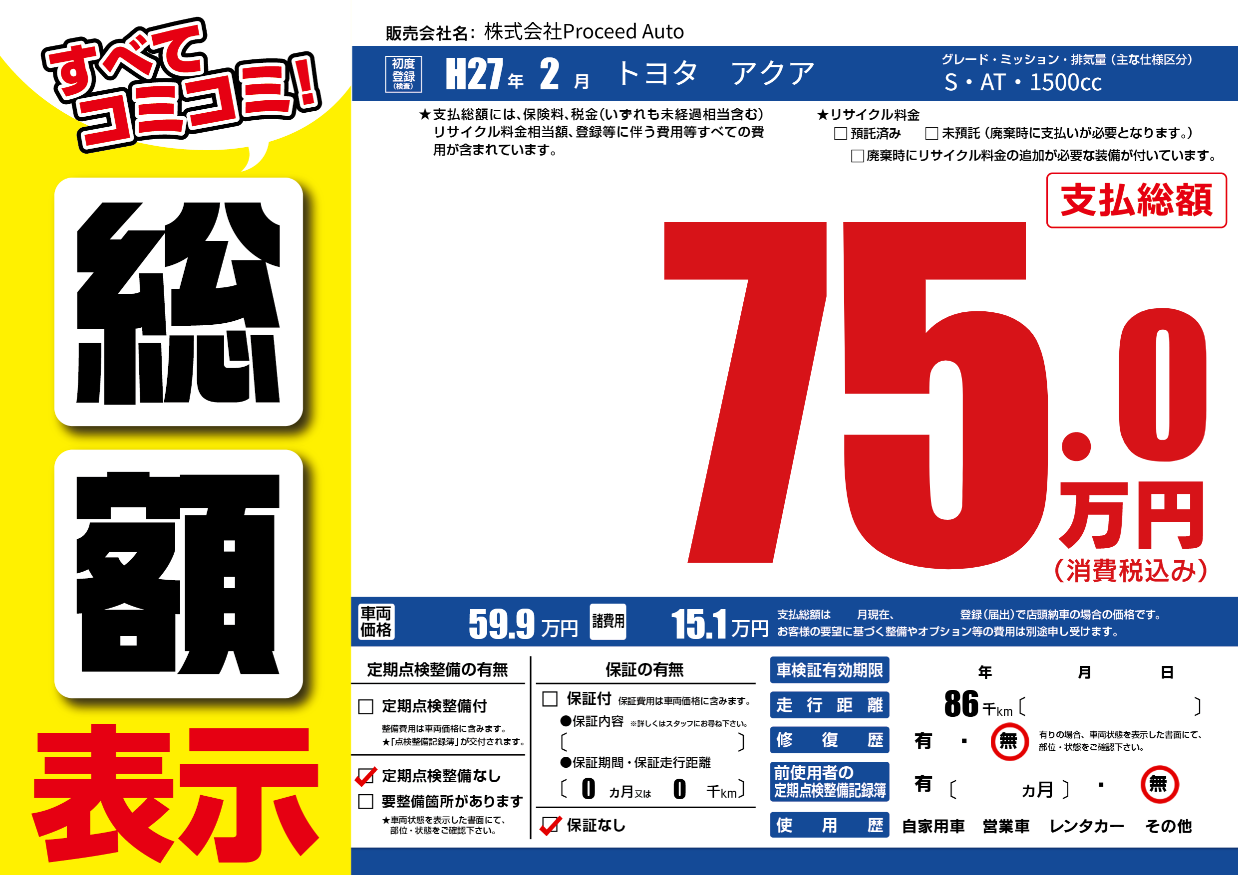 | 車名 | トヨタ アクア | グレード ミッション 排気量 |