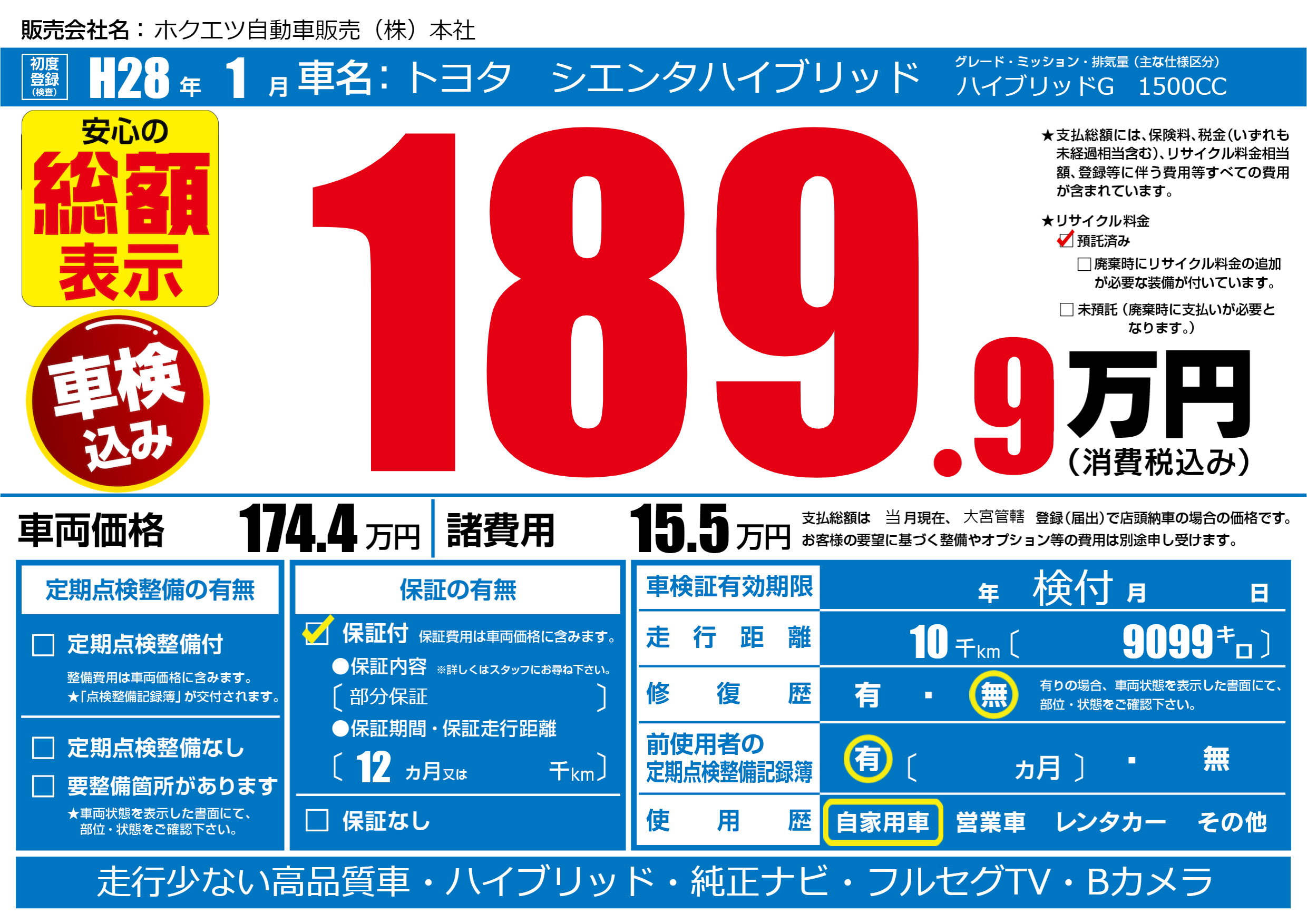 | 車名 | トヨタ シエンタハイブリッド | グレード ミッション 排気量 |