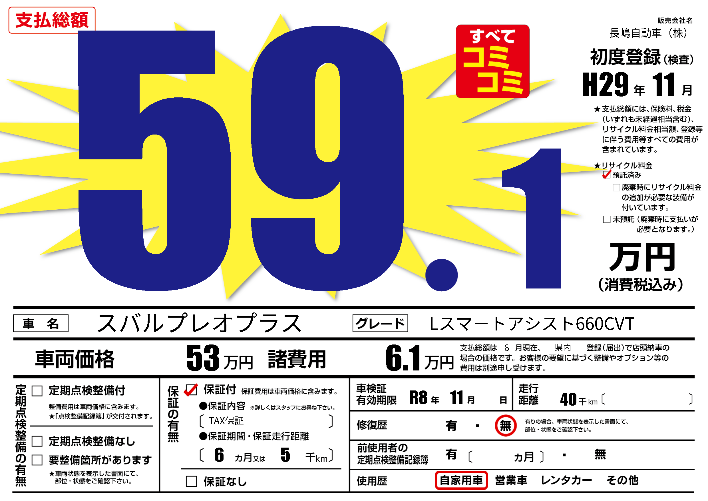 | 車名 | スバルプレオプラス | グレード ミッション 排気量 |