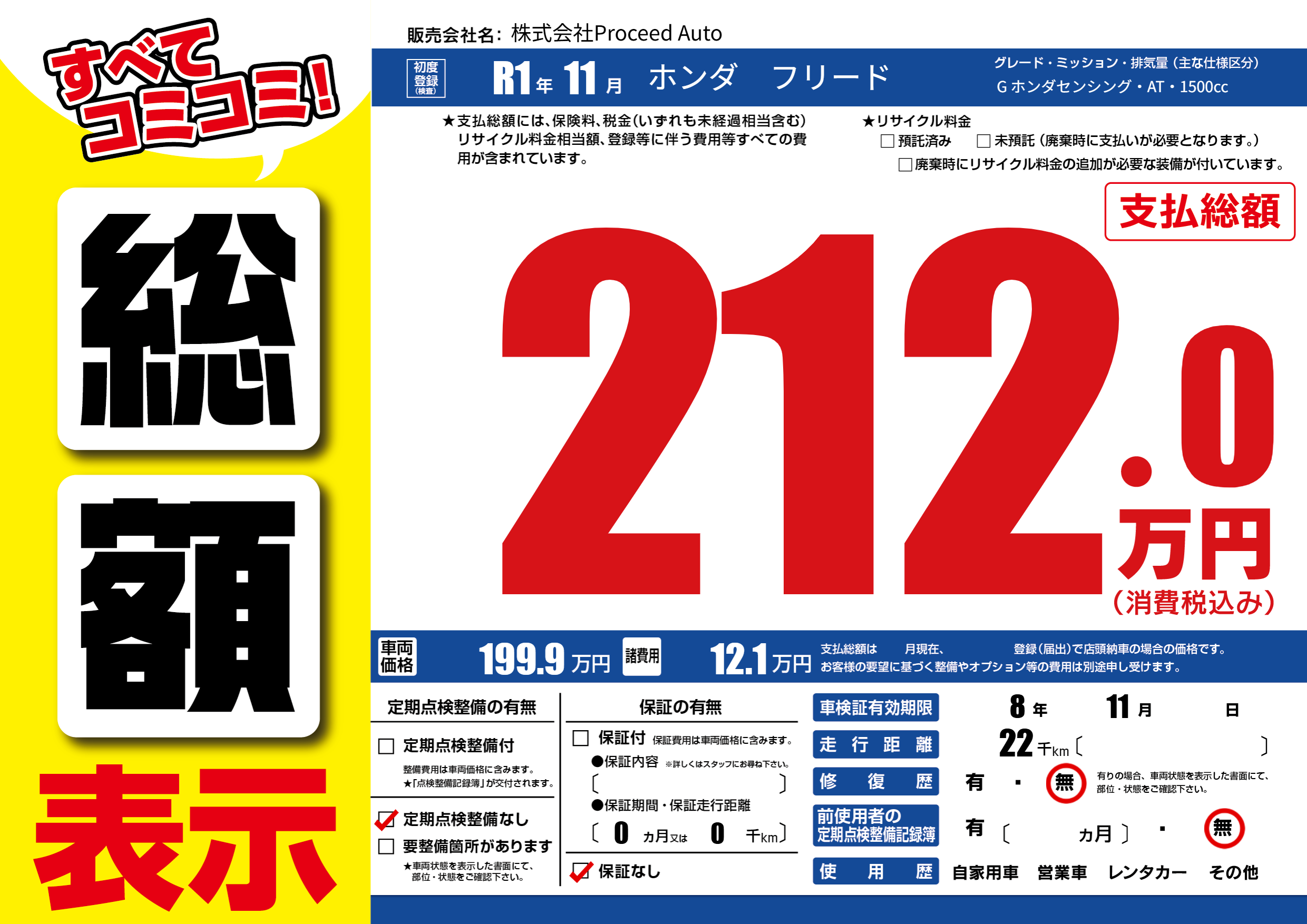 | 車名 | ホンダ フリード | グレード ミッション 排気量 |