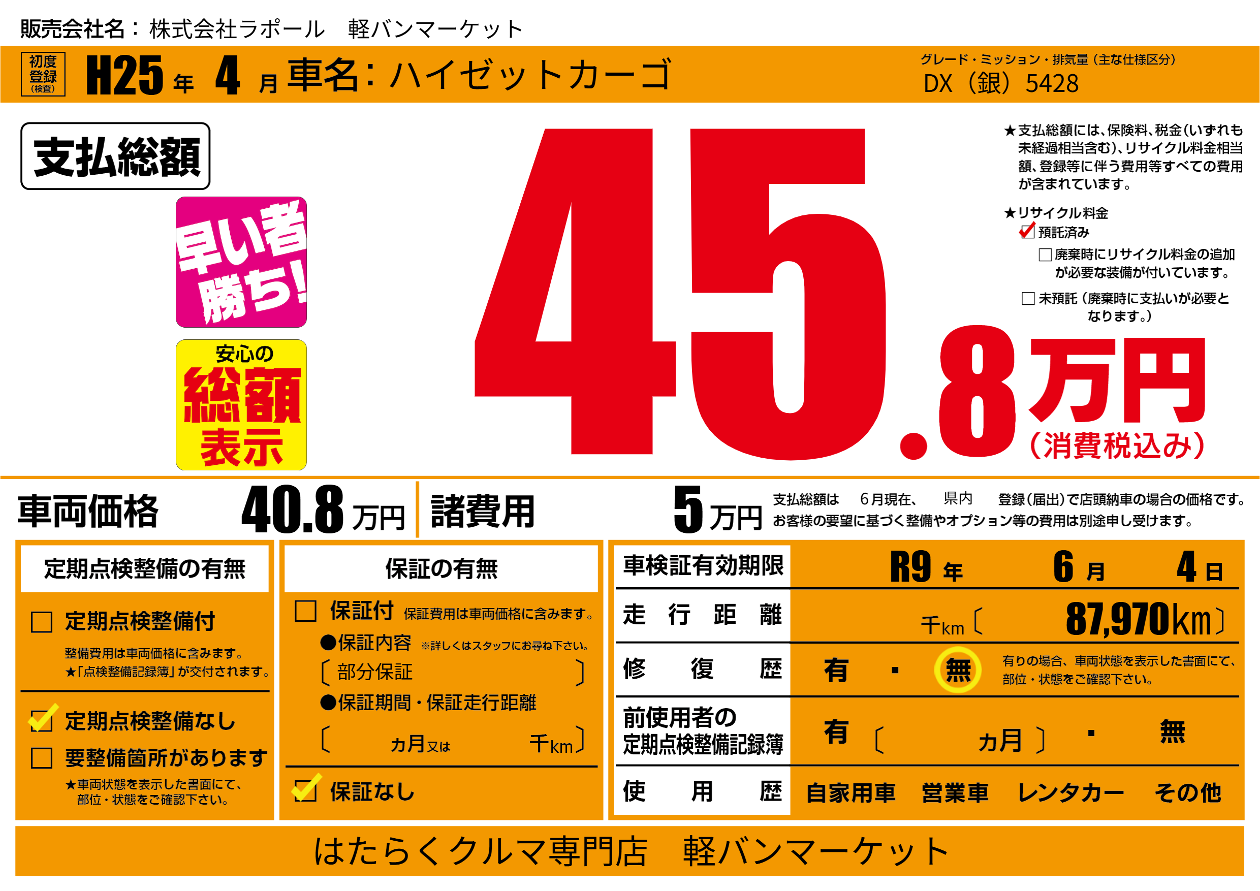 | 車名 | ハイゼットカーゴ | グレード ミッション 排気量 |