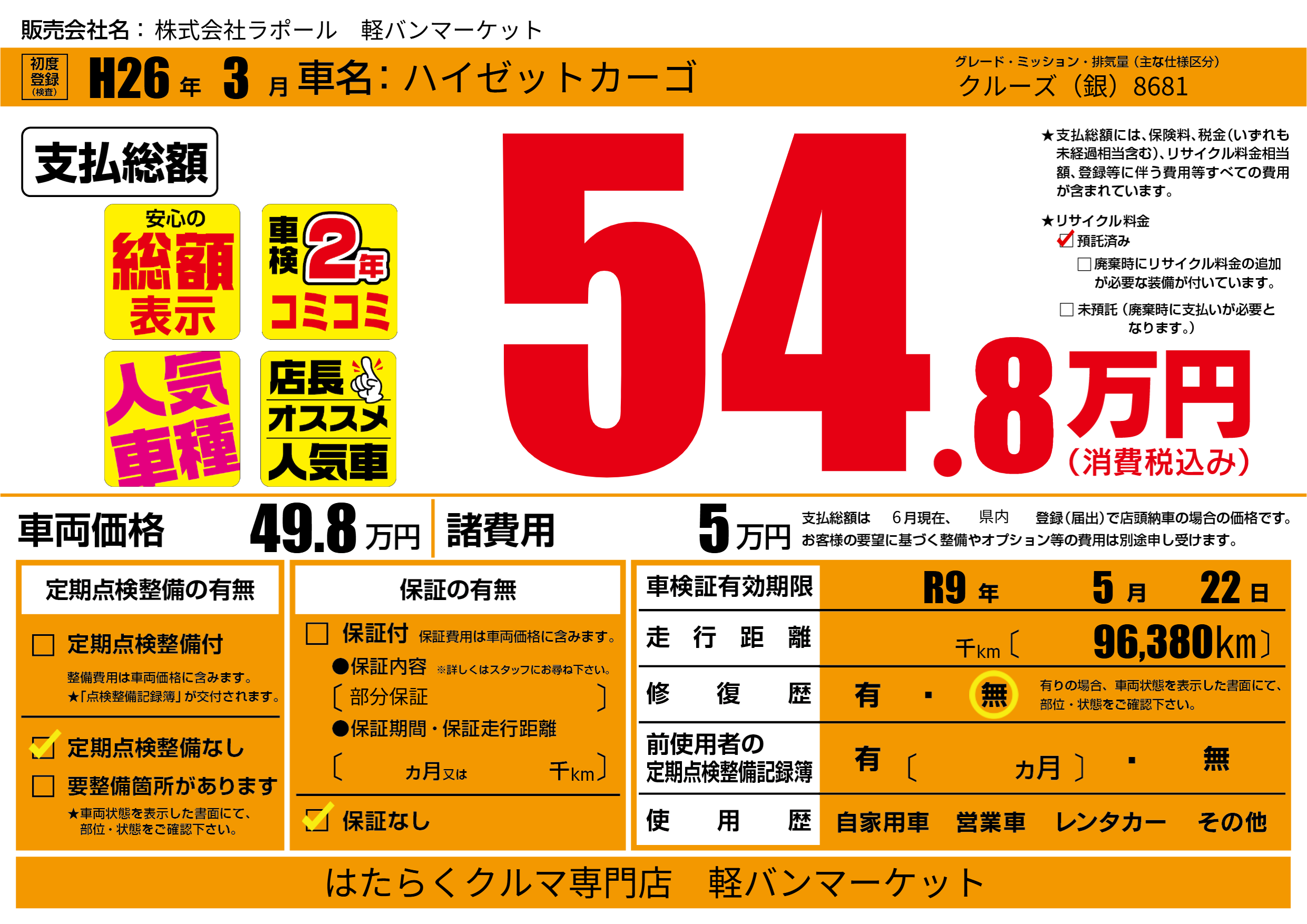 なし | 車検制限 | R9年5月22月 |