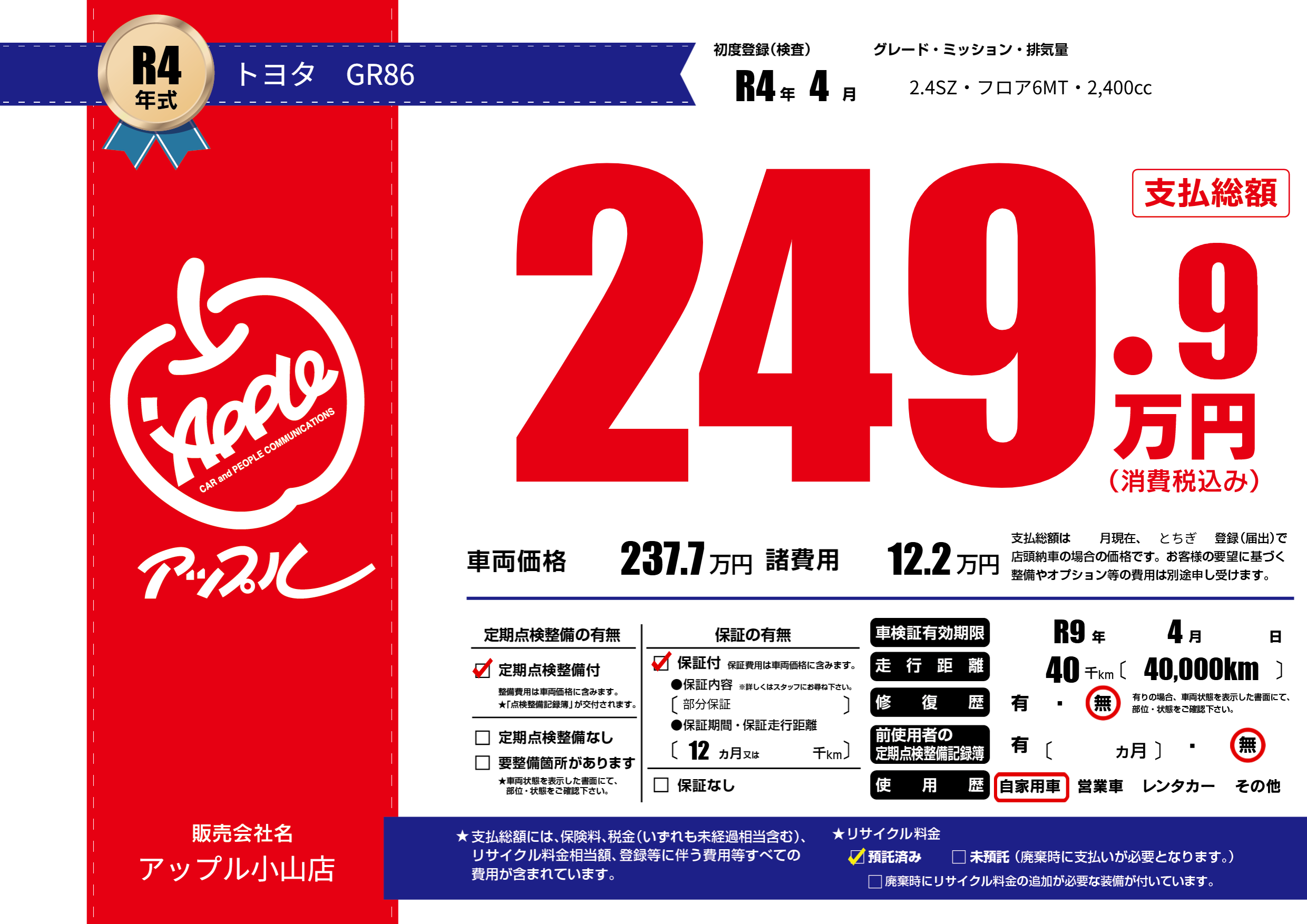 | 車名 | トヨタ GR86 | グレード ミッション 排気量 |