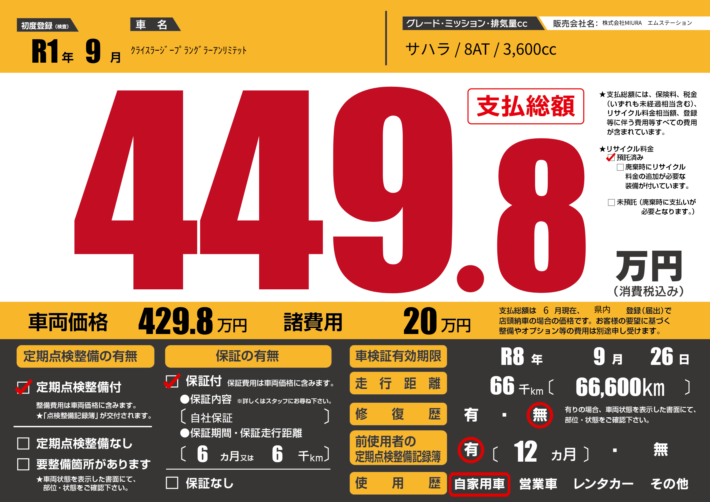 | 走行キロ | 6.6万km | 初年度登録 | R1年9月 |