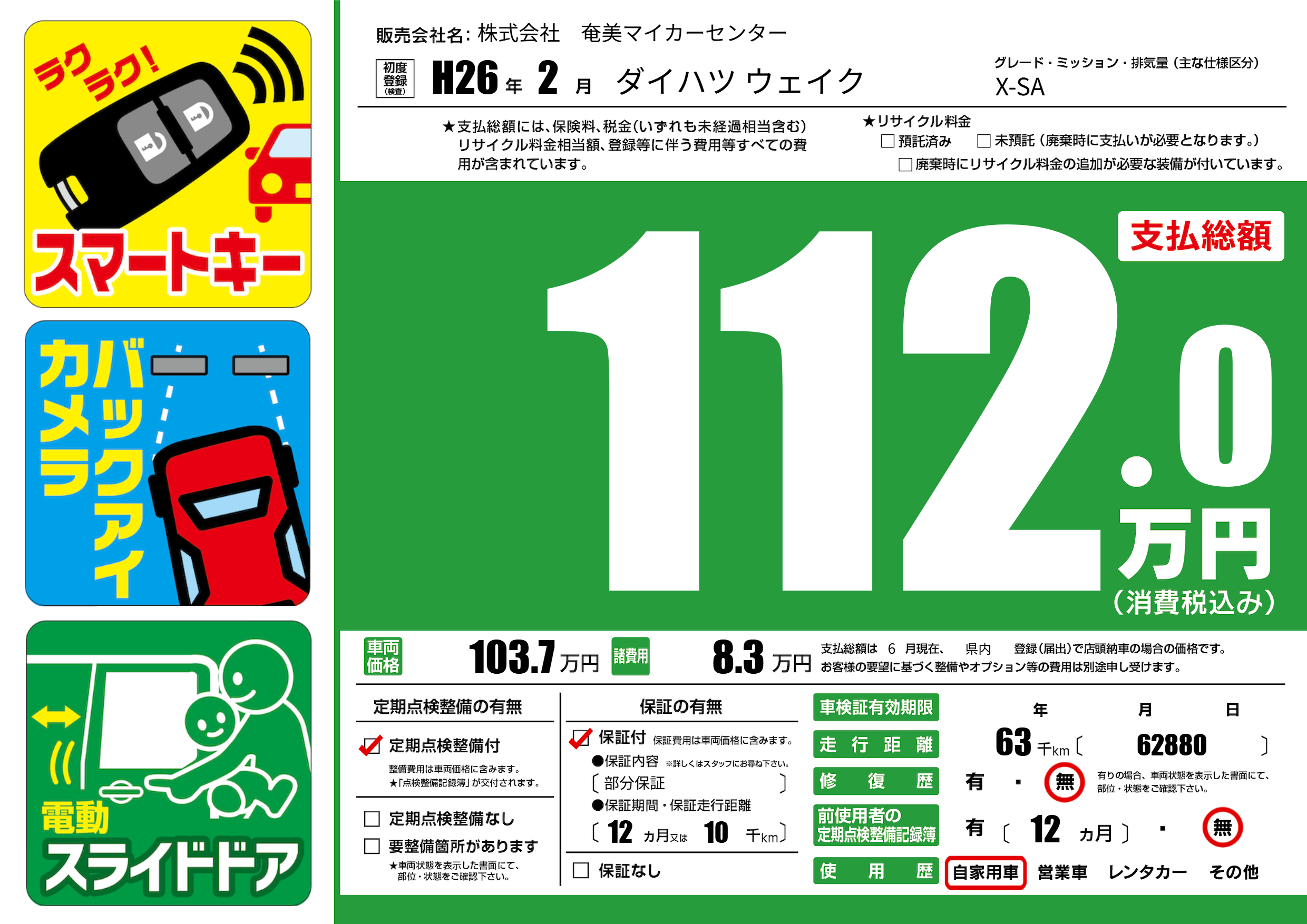 | 車名 | ダイハツ ウェイク | グレード ミッション 排気量 |