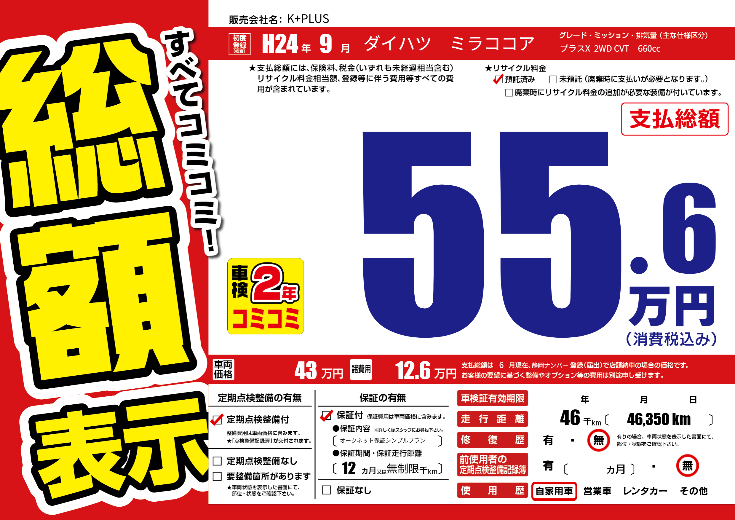 | 走行キロ | 4.6万km | 初年度登録 | H24年9月 |