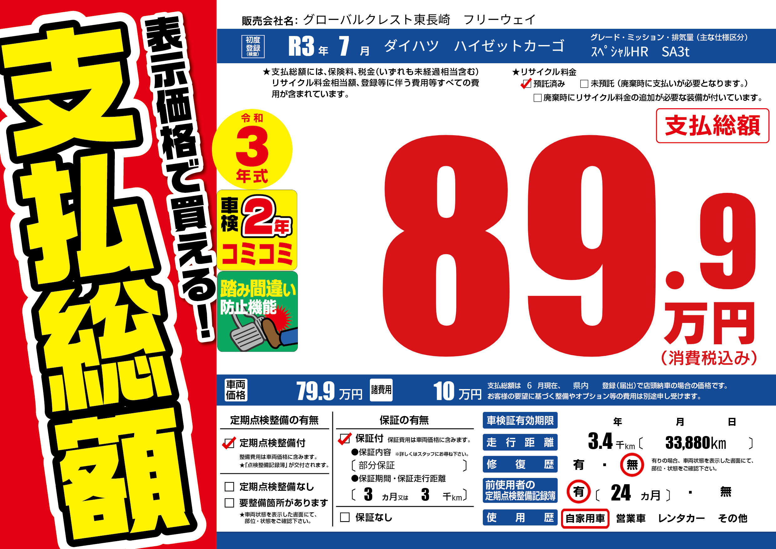 | 車名 | ダイハツ ハイゼットカーゴ | グレード ミッション 排気量 |