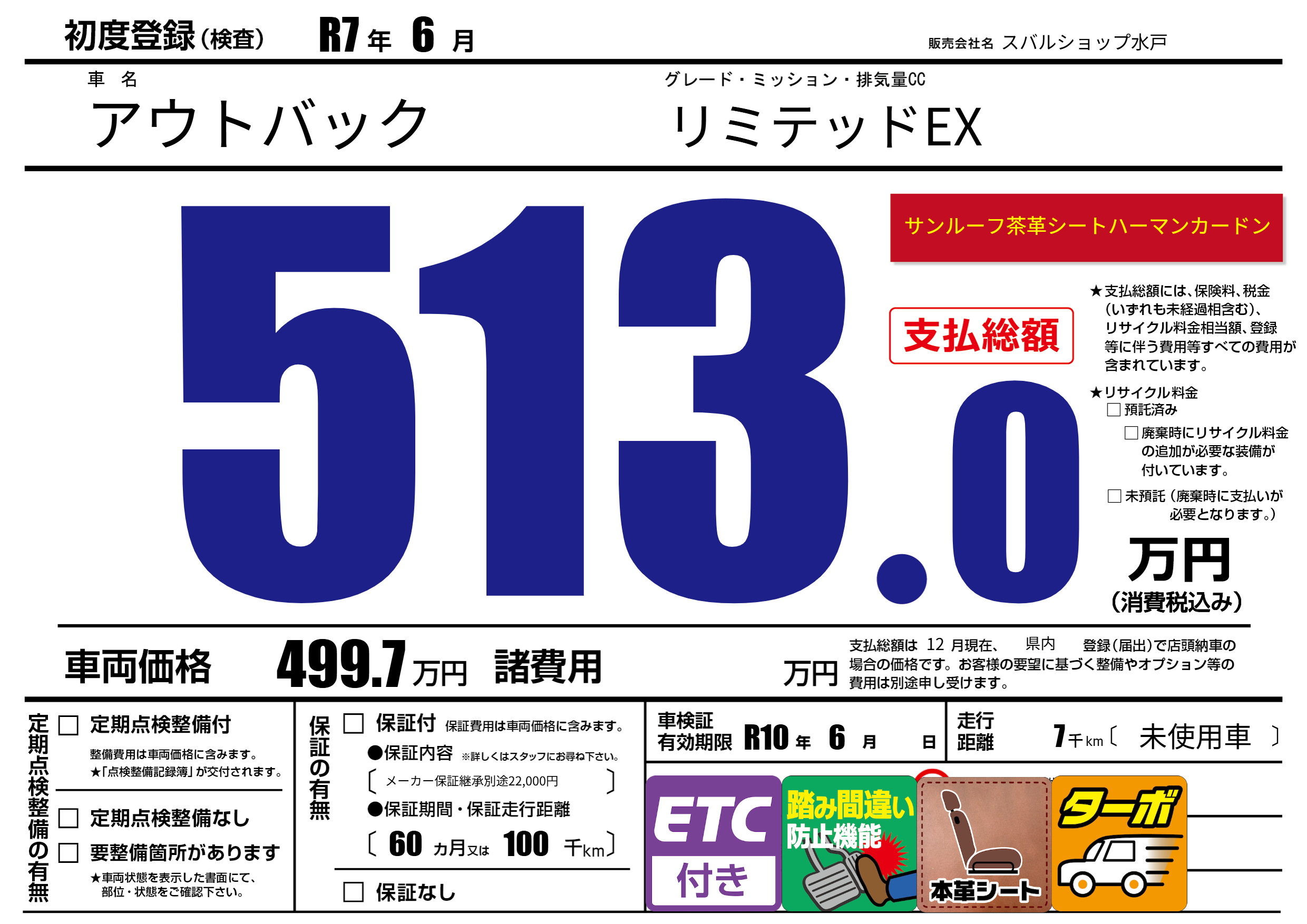 | 車名 | アウトバック | グレード ミッション 排気量 |
