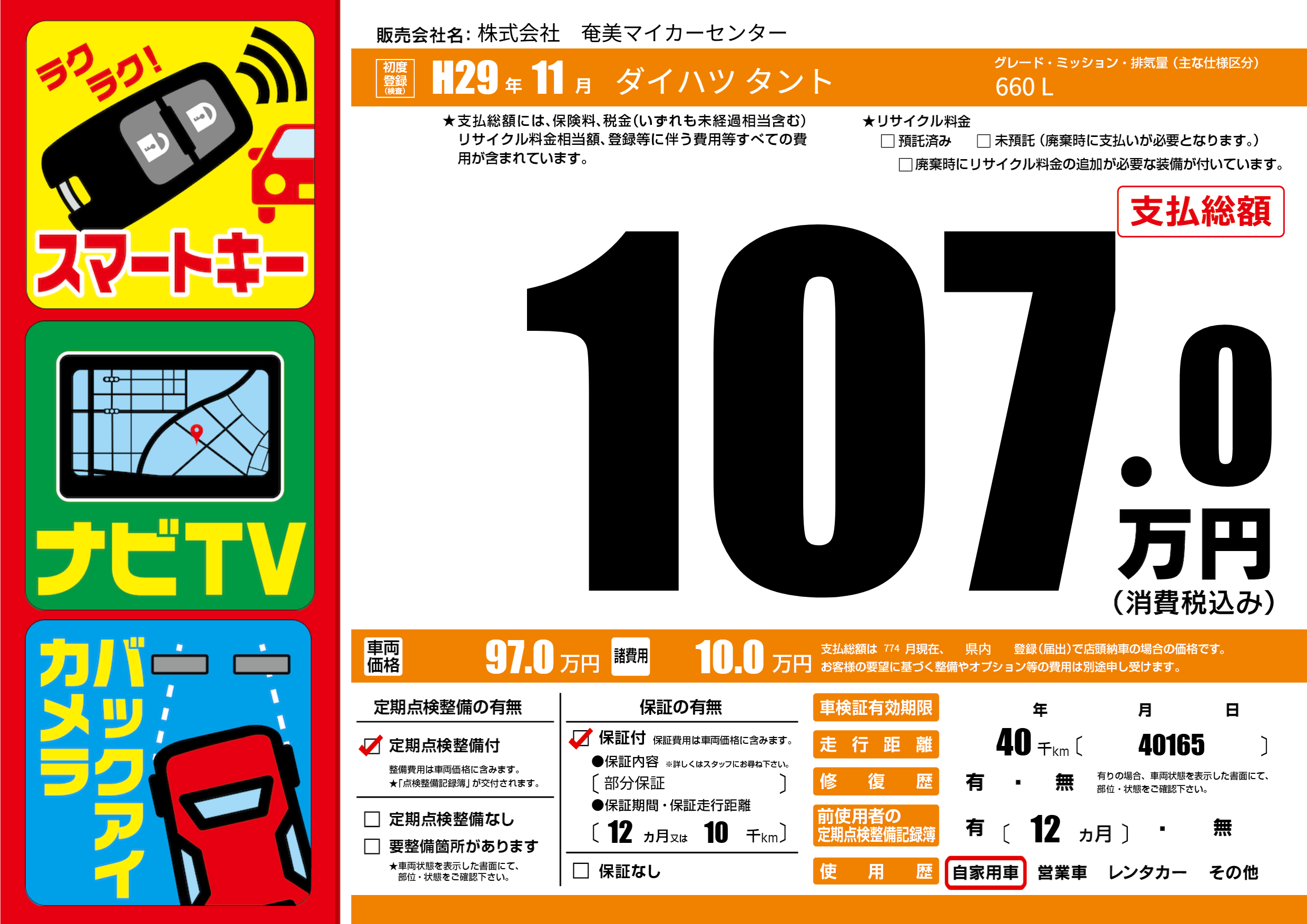 | 走行キロ | 4万km | 初年度登録 | H29年11月 |
